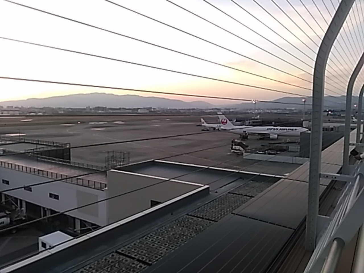 伊丹空港の4階にあります。あまり気づかないかもしれません。JAL側ANA側があり、今回は、JAL側に行って見ました。夕暮れ時でしたが、絵になりました。JAL側のデッキ手前には、よしもとエンタメショップやNMBのグッツコーナーもありました。
