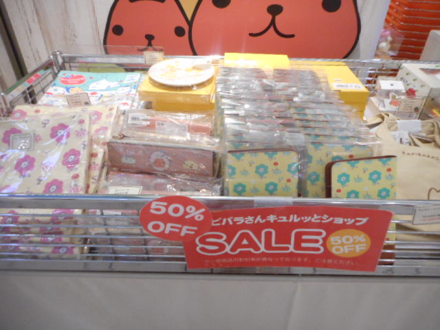 東京駅の地下街の一番街にある「東京キャラクターストリート」ショッピングで訪問しました。お店内はカピバラさんだらけです。お店の雰囲気は草原をイメージしたそうで、芝生っぽい緑の店内にふわふわのカピバラさんがいます。店頭にSALE商品もありました。