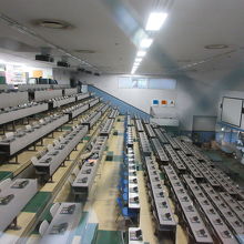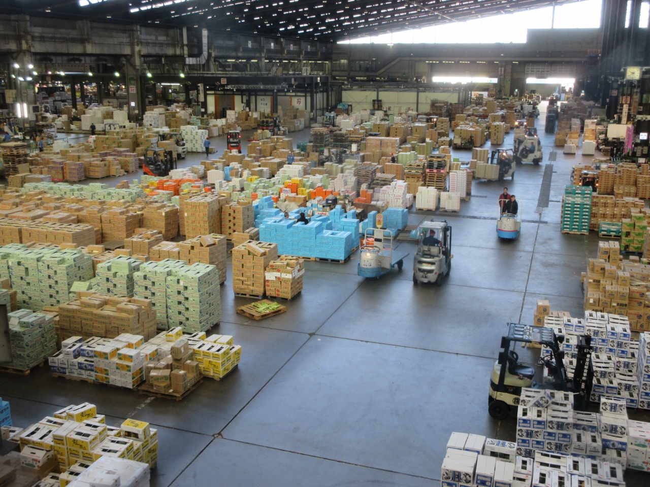 東京ドーム9個分の敷地に造られた市場です。青果、水産、花木を取り扱っていて、青果と花木の取扱量は国内最大です。正門入った左側にある展示室で、市場の様子や見学コースについて説明をしたり、地図やパンフレットを配布したりしてくれます。青果、水産、花木売場の様子は、それぞれ見学コースがあり2階から眺めることができます。9時過ぎに到着したにもかかわらず、ターレやフォークリフトが忙しく動いていました。早朝6時前からパソコンを使って行われるセリの様子もガラス越しに見ることができます。青果棟に向かう通路には野菜数え唄の切り絵が飾られています。これまで一般の車は場内に駐車することはできませんでしたが、平成30年8月から入場できるようになりました。ちなみに私はそのことを知らず、東京港野鳥公園近くの駐車場に車を停めたため、正門まで30分近く歩く羽目になってしまいました。なお青果棟から花木棟までは10分ほど歩かなくてはなりません。活気ある市場の様子を見学する場合は、朝6時ごろから8時ごろまでがおすすめです。
