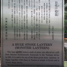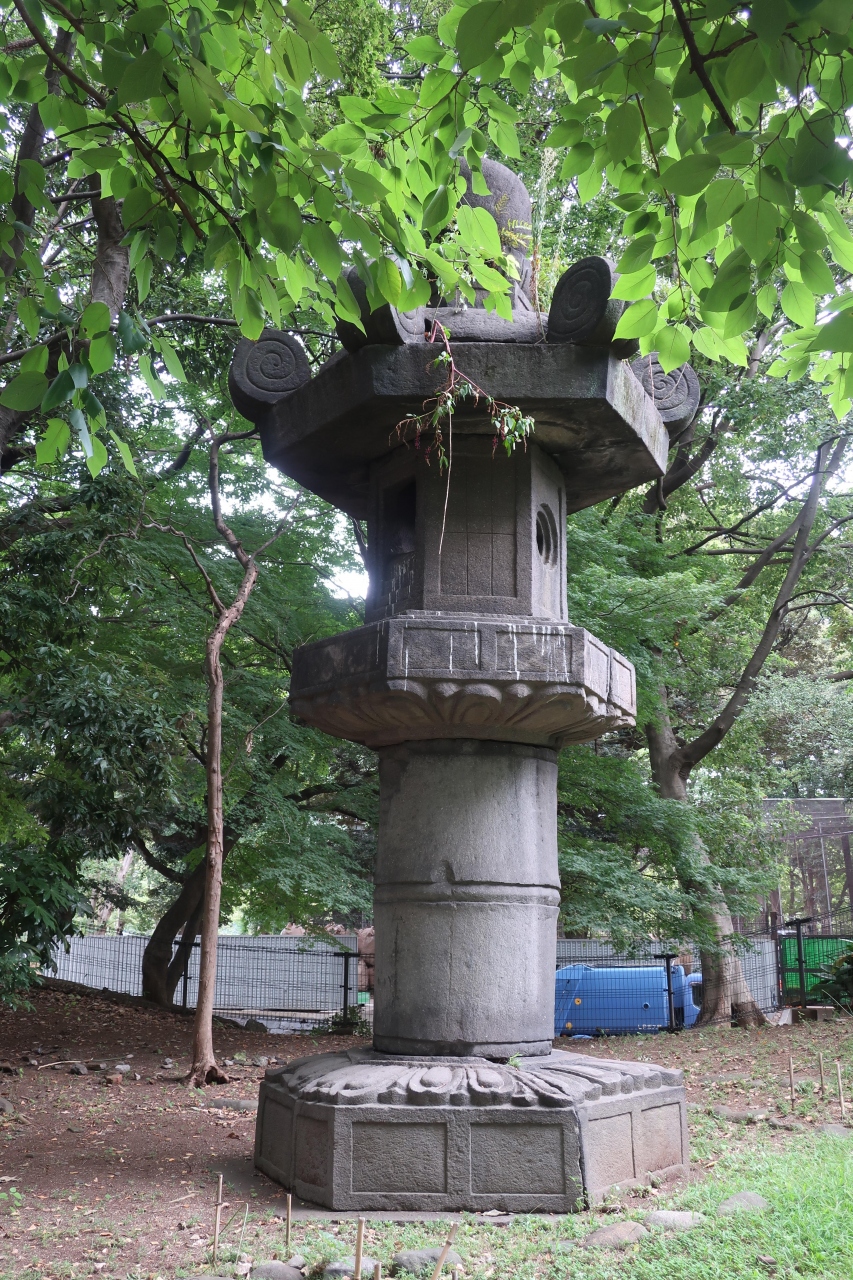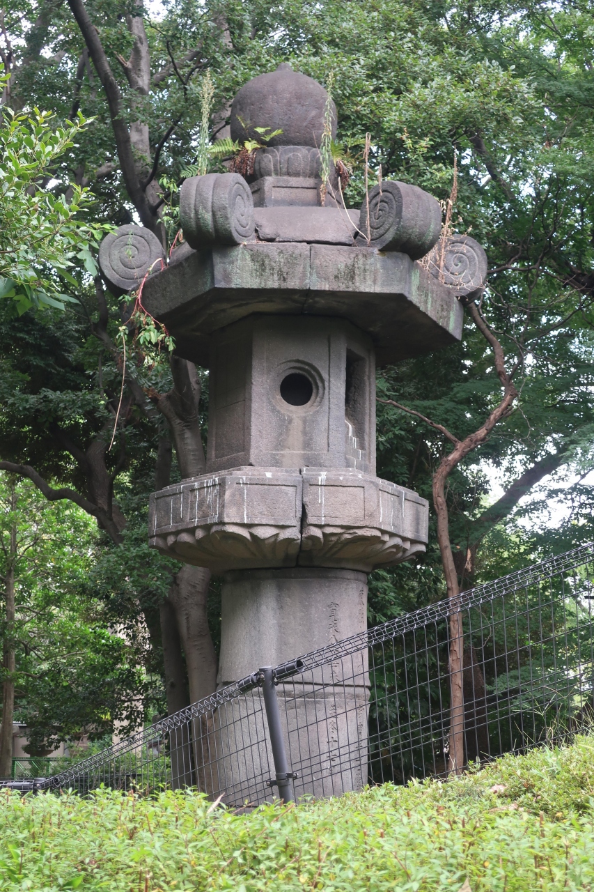上野恩賜公園の中、上野大仏の北側にお化け灯籠はあります。これまでも何回も周辺を歩いていたのに、木陰に佇む様に置かれていたのと、人が近づけない様になていたので、こんなに大きな灯籠があるなんて知りませんでした。