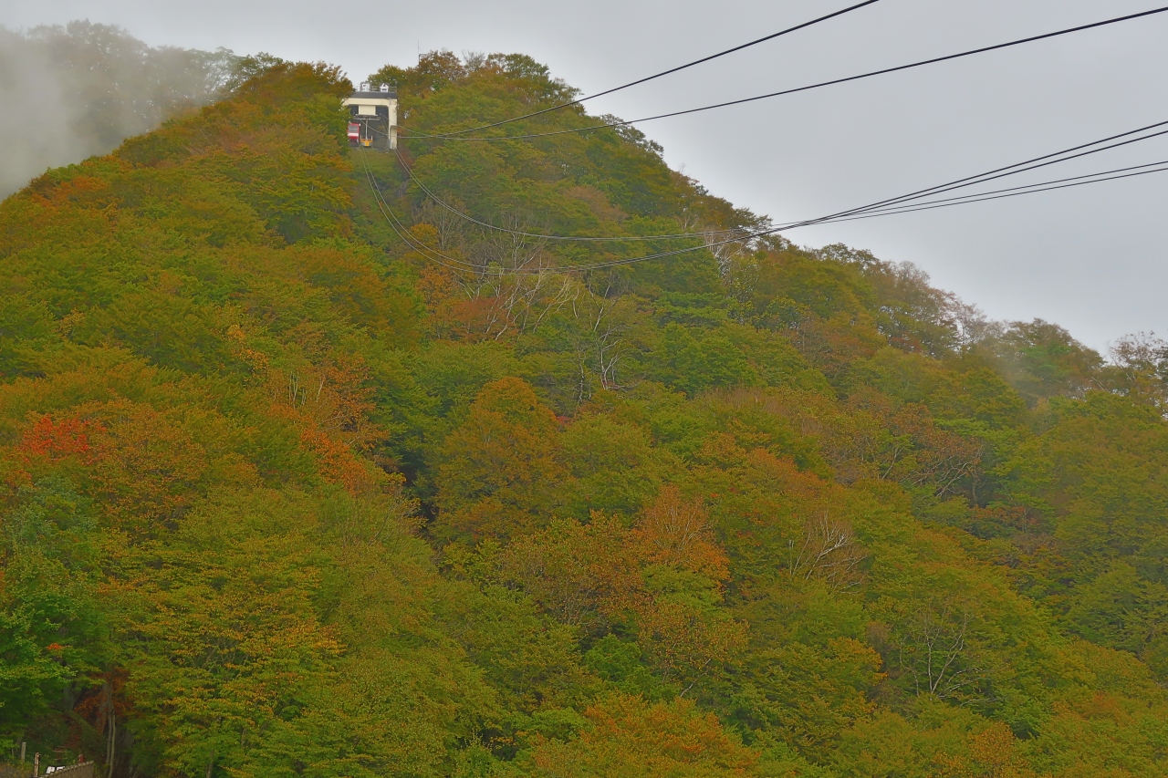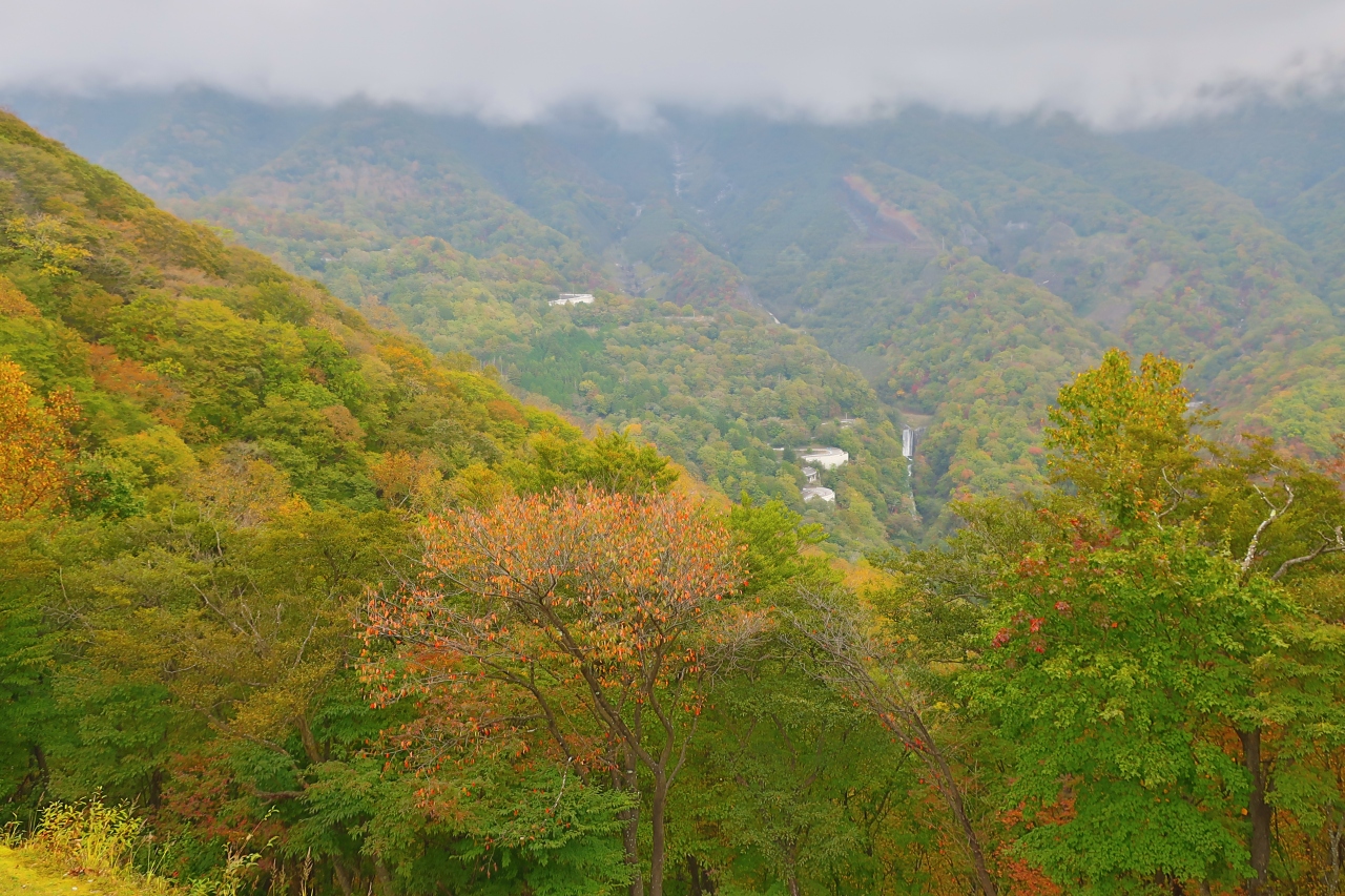 明智平からはいろは坂周辺の紅葉の始まった山々が見られました。本当は明智平展望台から華厳の滝を見たかったのですが、雲が低く眺望不良で諦めました。