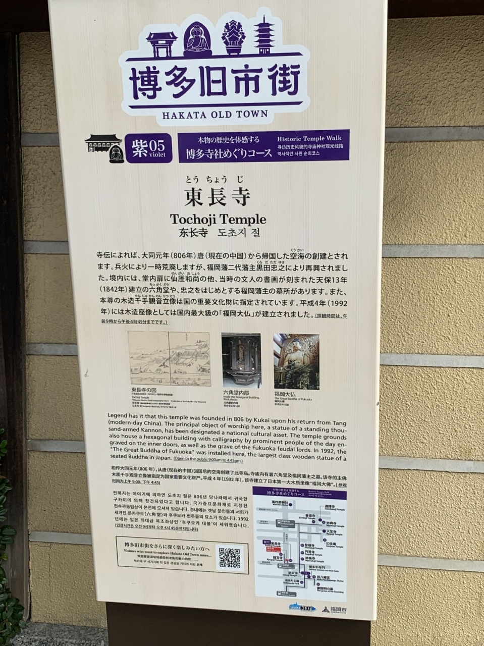 東長寺は地下鉄博多駅の次の駅である祇園町から徒歩1分の場所にあります。東長寺は真言宗九州教団の本山で弘法大師創建の寺としては日本最古で、当初は海辺の地にあったのを福岡藩二代藩主 黒田忠之によって今の場所に移しました。敷地内には福岡藩主二代、三代、八代の黒田家墓所があります。五重塔は外国人観光客にも人気でした。また、拝観料50円で木造座像日本最大の大仏があり必見です。
