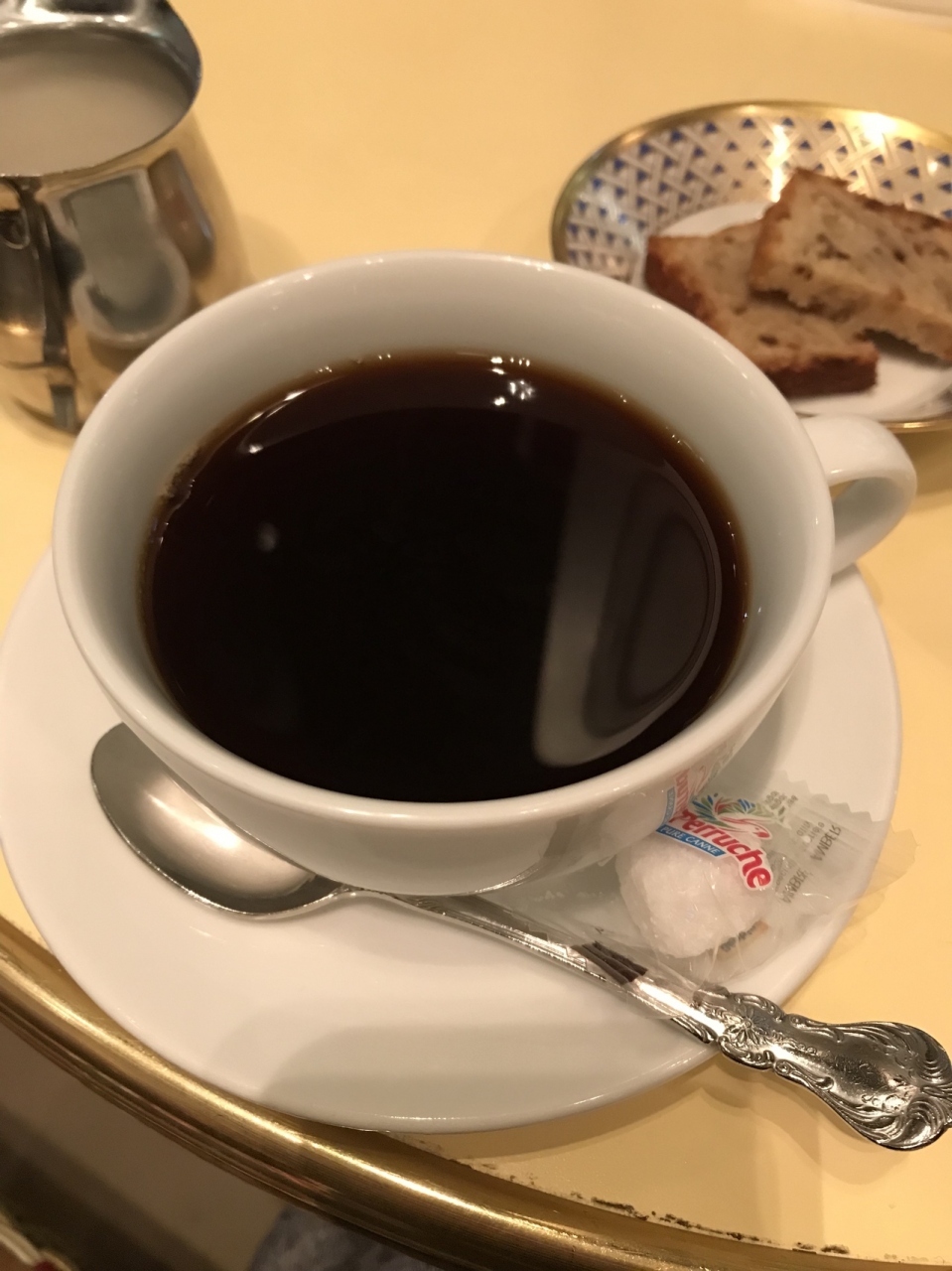 お一人様でも入りやすい、フレンチカジュアルな内装のお店です。席数は多くありません。季節ごとに雰囲気が変わる通りの景色を眺めながら、食事やケーキを楽しむことができます。個人的には、ここの大人な味わいのケーキが好きです。今、キャンペーン?をしているようで、先日訪れた際に焼き菓子サービス券を頂いたので、今回それを利用してブレンドコーヒーを注文しました。クルミが入っているケーキで、こちらもやはりいいお味でした。コーヒーは酸味がある方かなと思います。帰りにまた新たにサービス券を頂いたので、キャンペーンはまだ継続中のようです。