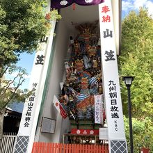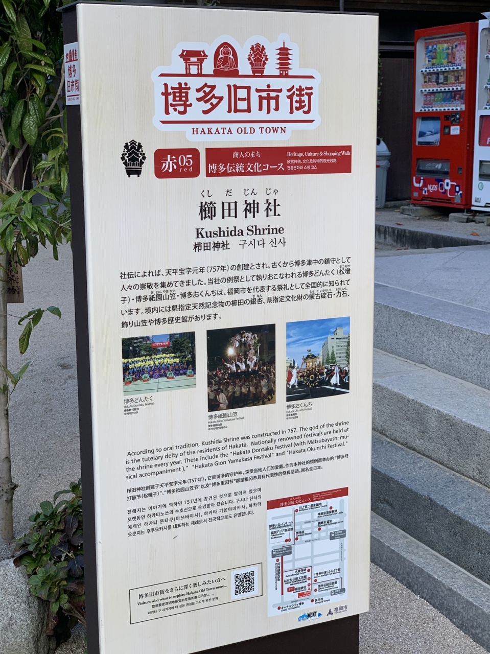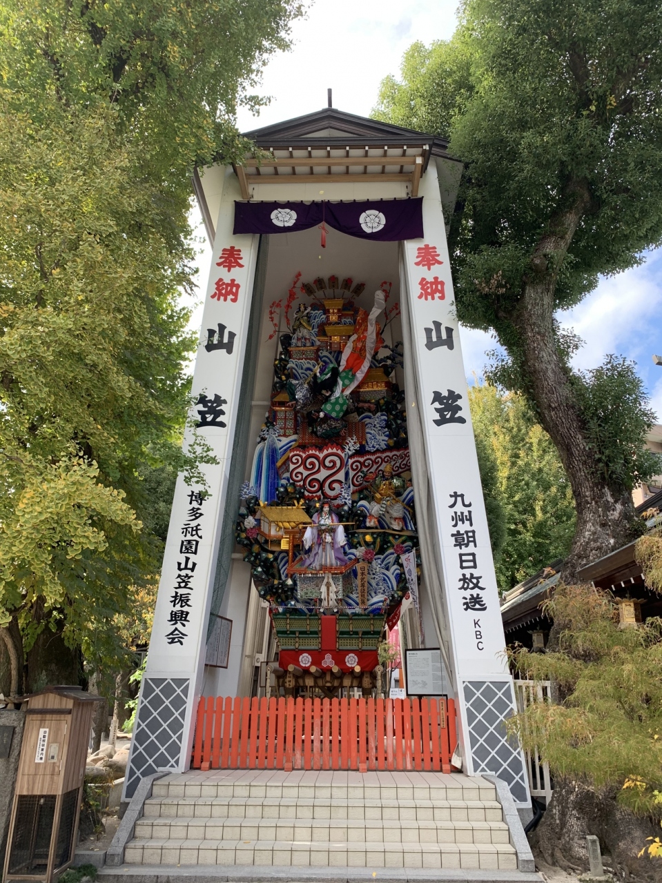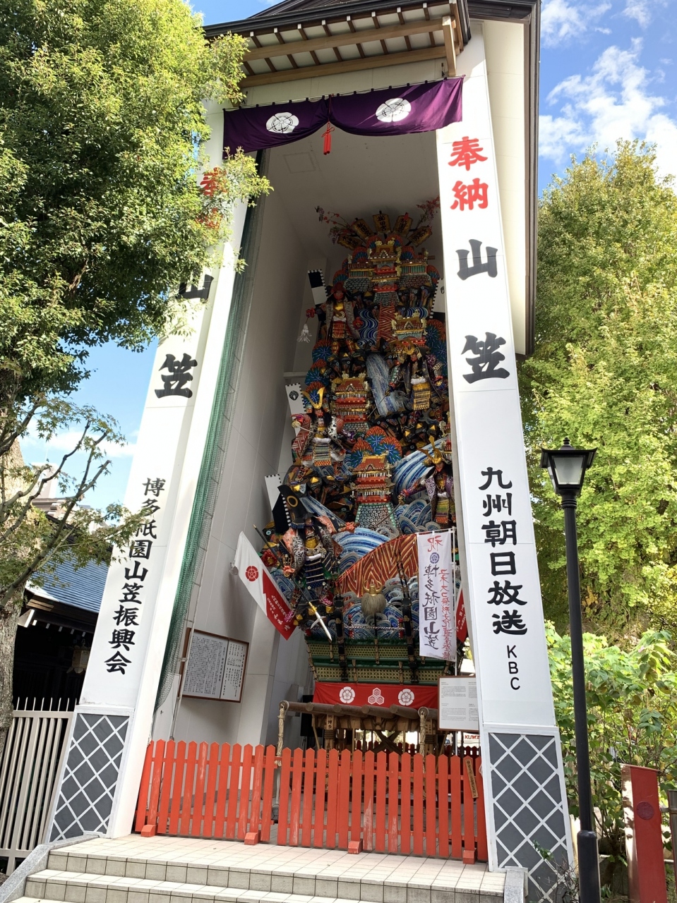 櫛田神社には博多祇園山笠が奉納されていましたが、間近で見るとかなり大きかったです。外国人にも人気の場所で団体で訪れてました。また、境内の大きなイチョウの木が色付いてました。