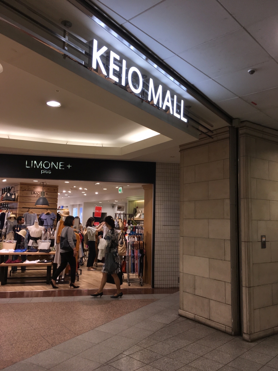 京王百貨店や京王新線新宿駅などと接続している京王モール。京王新線新宿駅にむかうゆるやかな坂がちょっとめずらしい構造です。ファストフードやコンビニエンスストアがありますし、成田空港に行くバス停にも近いので、ここで飲み物や食事を用意するのも便利です。