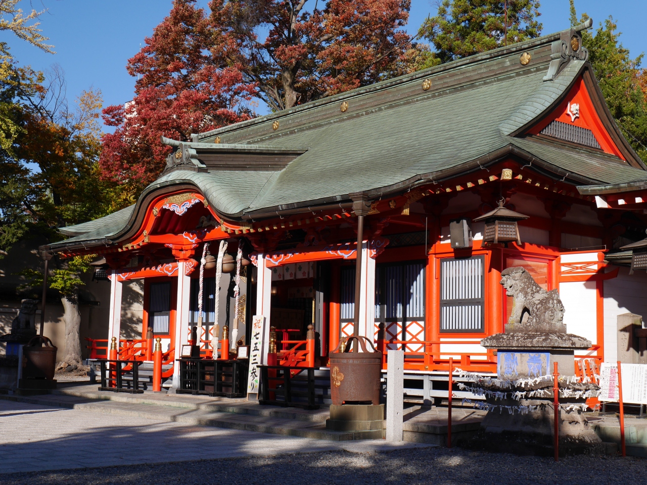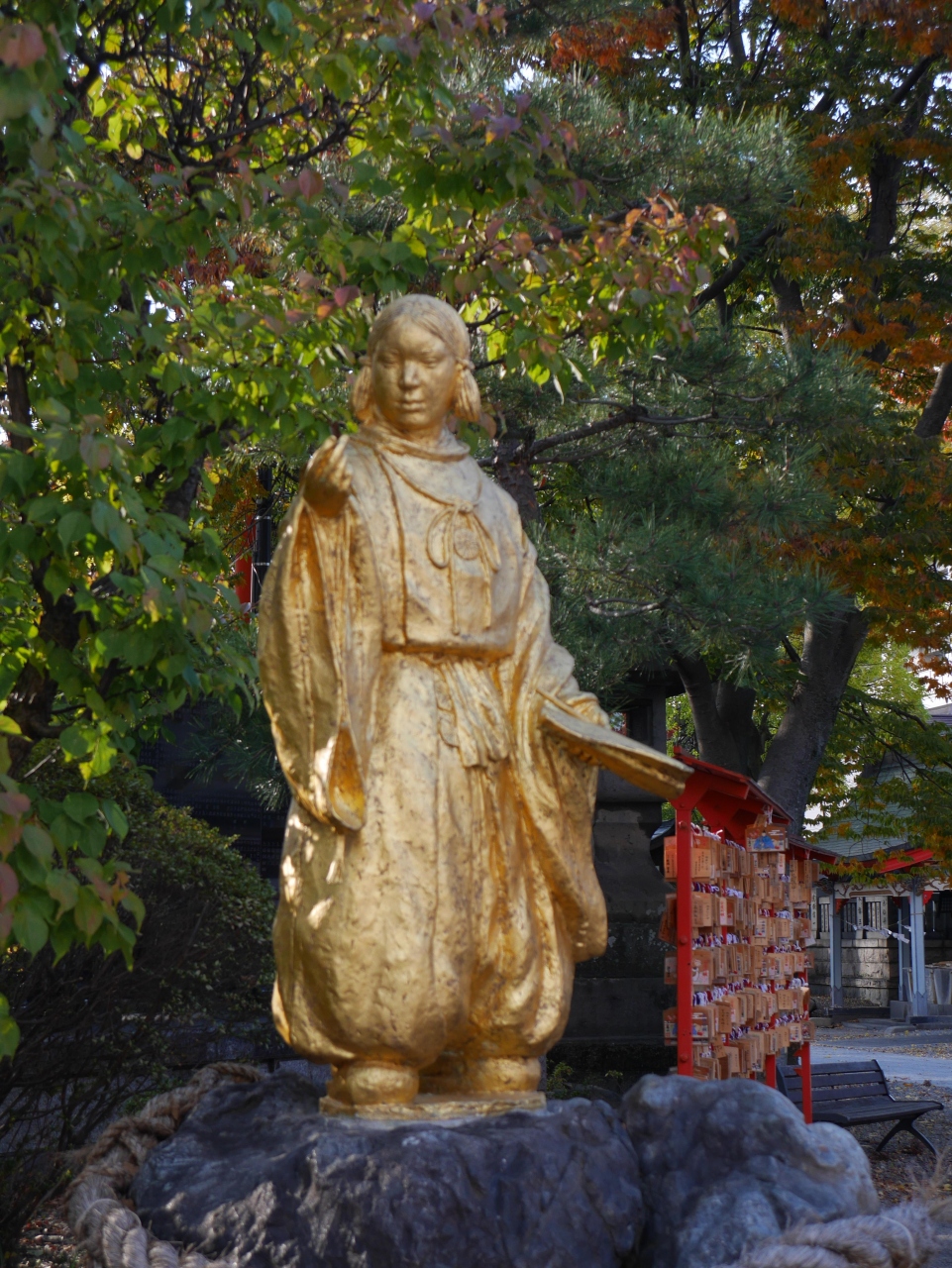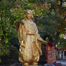 周囲の緑に本殿や神楽殿の朱色が映え、美しいです。金色に輝く道真公の像も印象的でした。