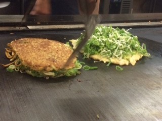 しっかり味のしみた牛筋を載せ、その上から、刻み葱を抑えるようにしっかり載せて焼き上げる。