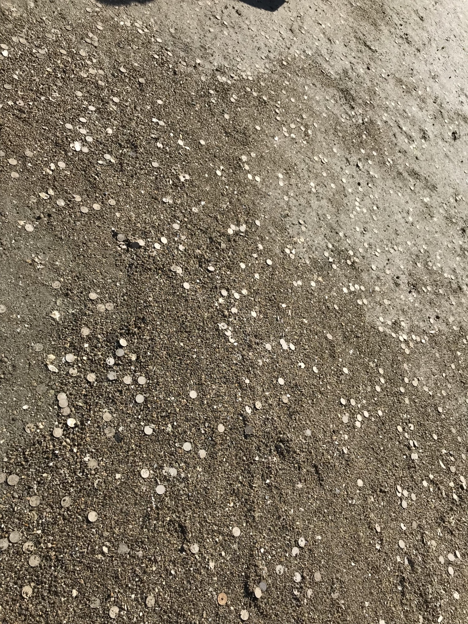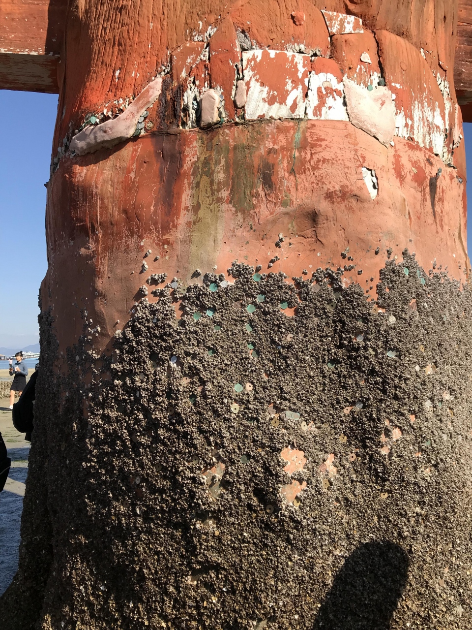 商店街で、昼食をとり、食べ歩きをしたり、お土産を買ったりして、また、大鳥居の方に行くと、潮が引いていて大鳥居の下には人だかりが!