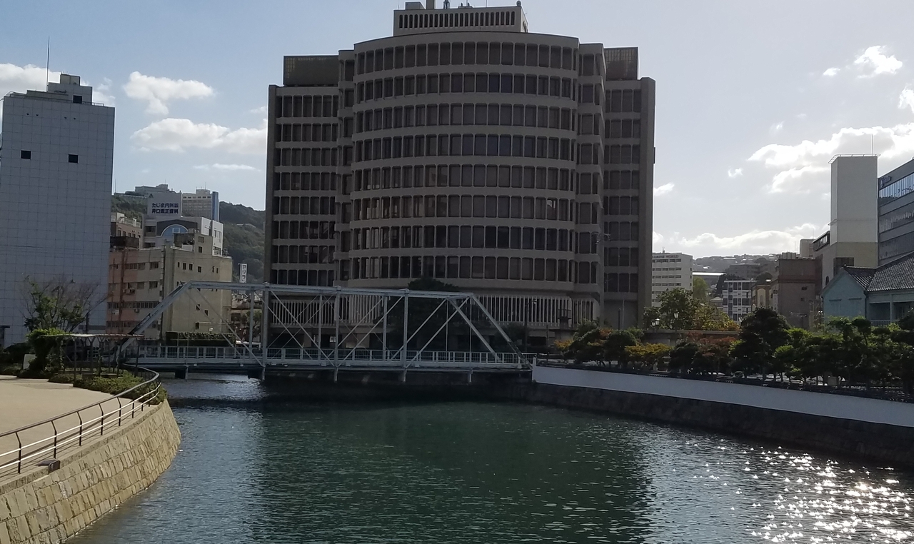 出島橋は、中島川に架かる橋の一つで、出島の東側にあります。明治中期に河口側に造られその後明治後期にこの場所に移されました。鉄製の頑強なトラス橋で存在感がありました。100年以上たった今でも道路橋として市民の足として活躍しています。