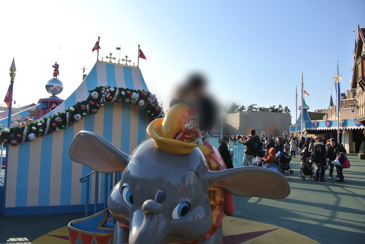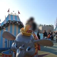 2人乗りのダンボの乗り物です。乗っている時は少し高いところからパーク内が見渡せて気持ちがいいです。小さな子どもでも乗れるので親子連れがたくさん並んでいます。平日でもそれなりに並びますが、朝早くや夕方以降はほとんど待ちが少ない状態なので狙い目かもしれません。