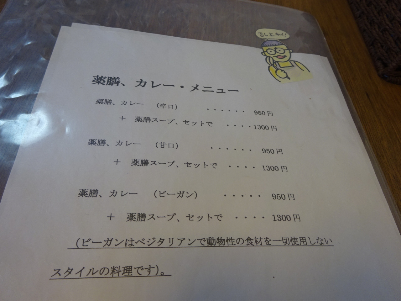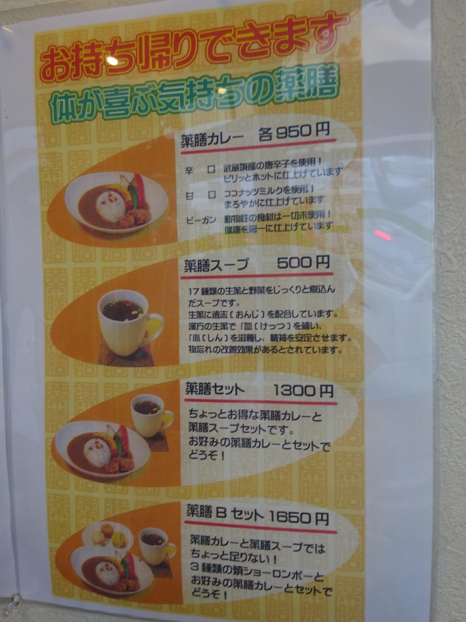 薬膳カレーと薬膳スープは、いろんな食材や生薬が混ぜ込んであるなあ、というのがなんとなく分かるのですが、違和感なくいただけます。見るからに(食べるからに?)体には良さそうだ、という感じがします。