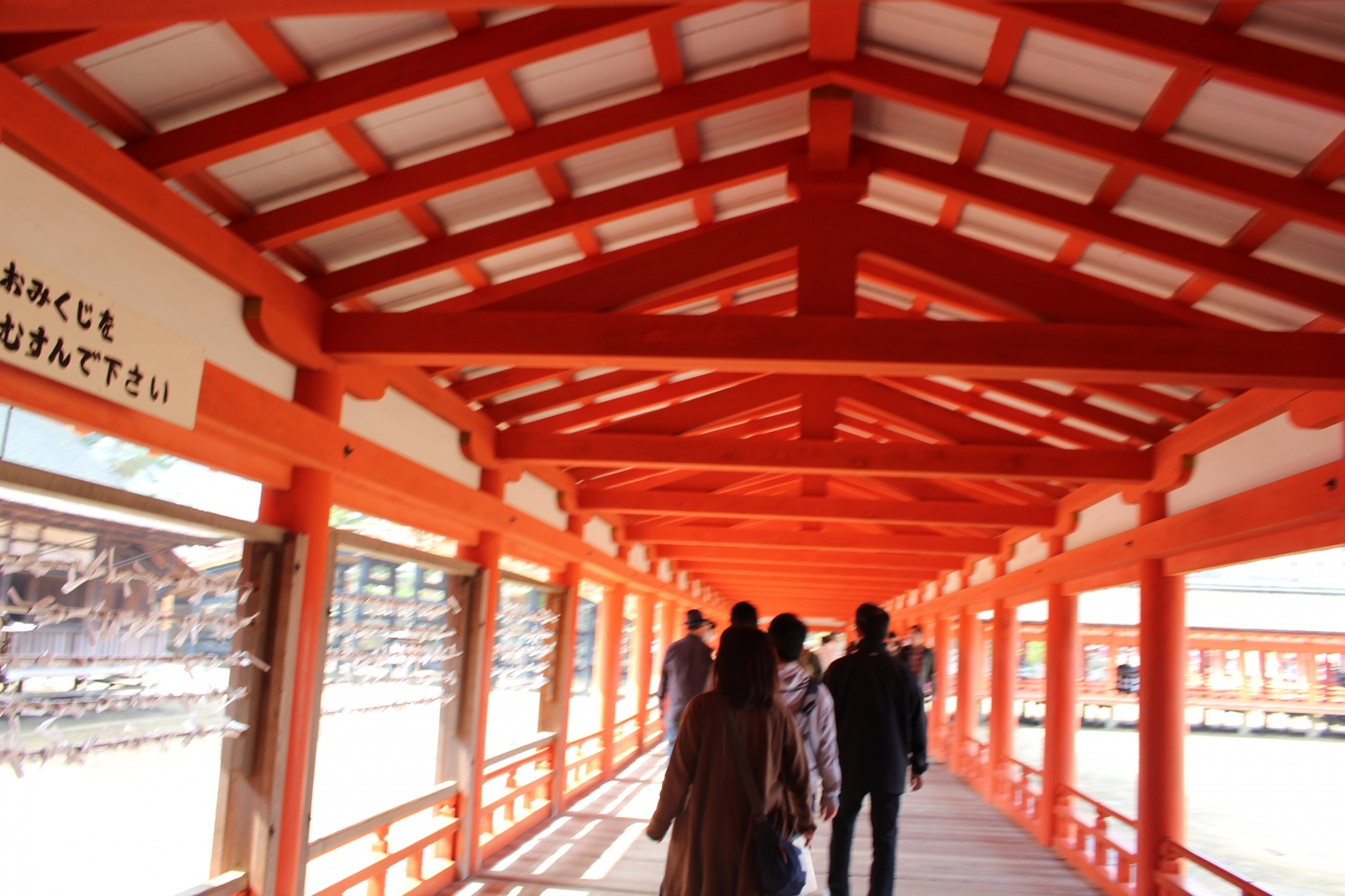 広島県の人気観光スポット、宮島にある厳島神社の廻廊です。社殿の東西を結ぶ廻廊は幅は4m、長さは275mあります。満潮時、下からの海水の圧力を弱めるための床板間に目透しという隙間が設けられています。朱塗りの柱が並んでいる景色と壁がないので開放的で眺めがよいです。平清盛も歩いたところを思うと歴史を感じます