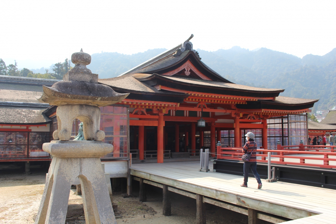 広島県の人気観光スポット、宮島のなかにある厳島神社の本殿です。市杵島姫命と田心姫命とたぎ津姫命をおまつりしています。平安時代の建築様式である寝殿造りを取り入れ、荘厳かつ優美な朱色の社殿がとてもうつくしいです。歴史を感じさせます