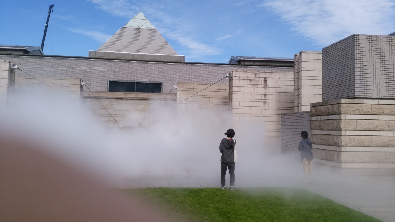 水戸芸術館は音楽、美術、演劇の3部門を持っていますが、その中で美術は、所蔵作品を持たず、すべて企画展、それも前衛技術です。時には館内だけでなく広場も使った作品が現れます。2018年10月末からは、中谷芙二子氏の「霧の抵抗」が展示されましたが、広場でも霧を発生させての展示でした。