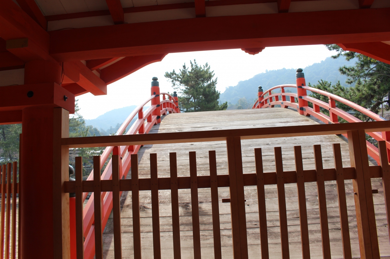 広島県の人気観光スポット、宮島にある厳島神社のなかのスポットです。かなりの角度で沿っている橋で入口には柵があり、現在は渡ることができません。別名、勅使橋と言われ、天皇が派遣する勅使が参拝する際に渡った橋だそうです。とてもうつくしく反っている姿はすばらしいものがあります
