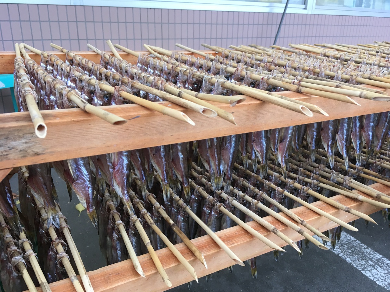 時期にもよりますが、店の前に干したしゃもがカーテンのように並んでいます。メス、オス、好きなサイズを選んでお会計。その後、店内でセルフ調理も可能です。店員さんの指導を受けながら、焼いたししゃもはふっくらしていました。普段食べるししゃもよりもお値段が張りますが、オススメです。