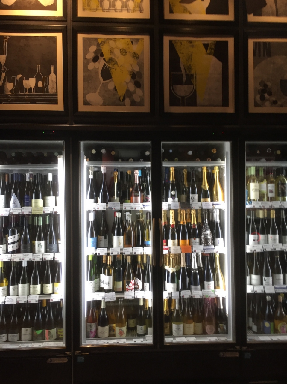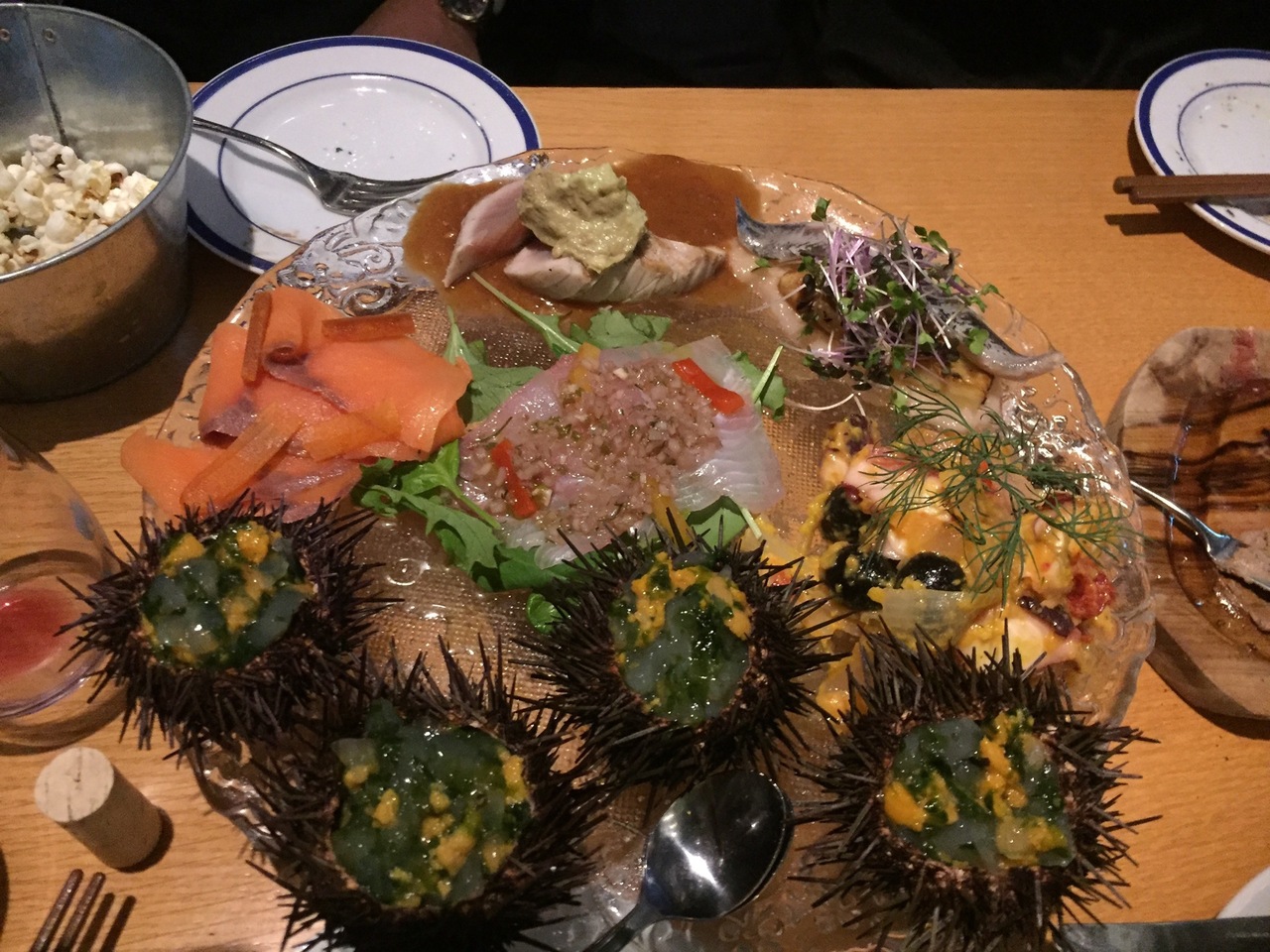 横浜駅西北口から徒歩3分くらいです。居酒屋ビルの4階でエレベーターを降りるともう店内で、目の前にワインが沢山並んでいました。雲丹やスモークサーモンなど、ワインにピッタリの魚介類の盛り合わせはかなりお得感満載でした。