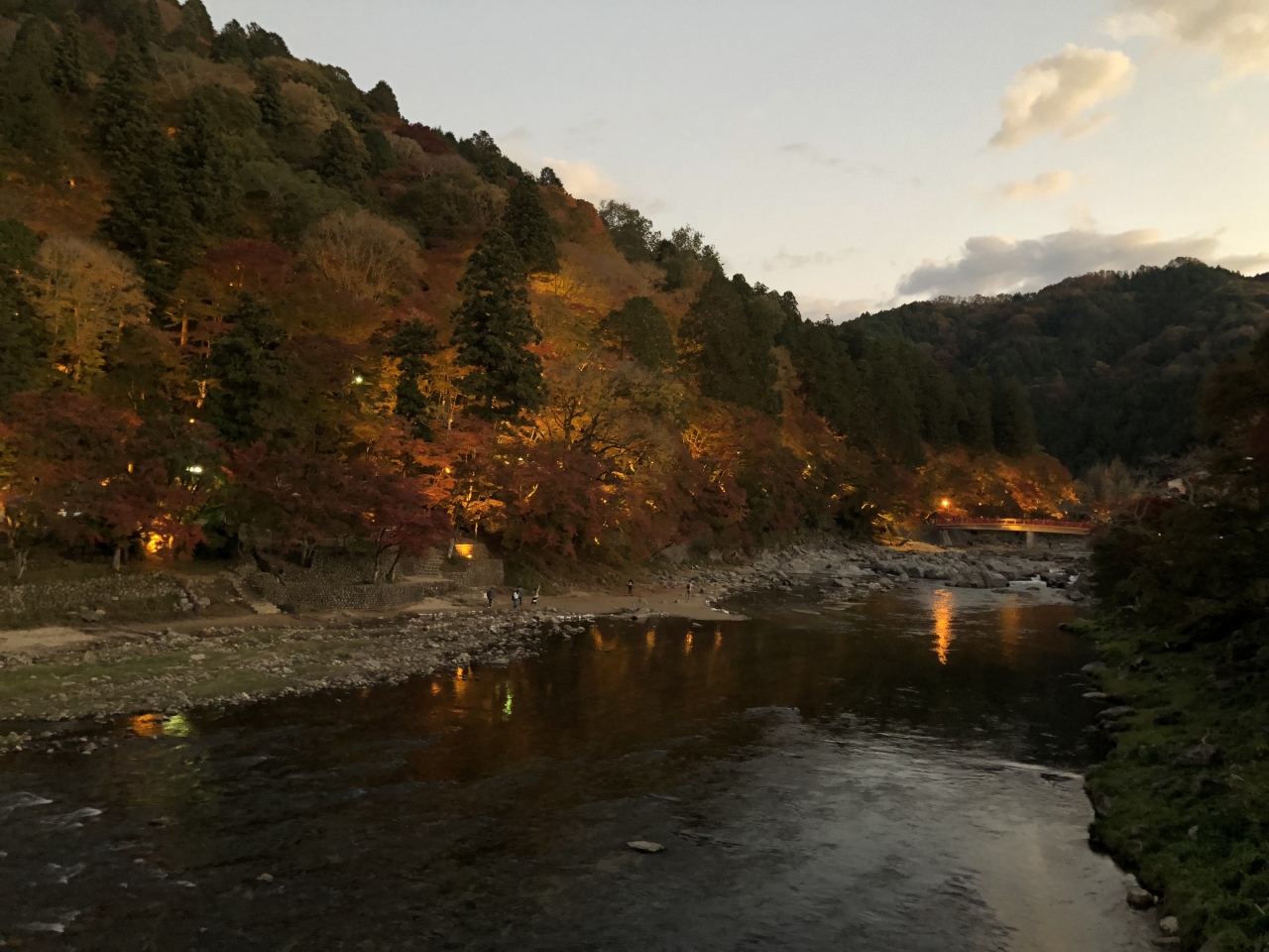 昼間の景色も良いですが、夜のライトアップも美しく巴川に飯盛山の紅葉と赤い待月橋が映り込む風景はとても見ごたえあります。