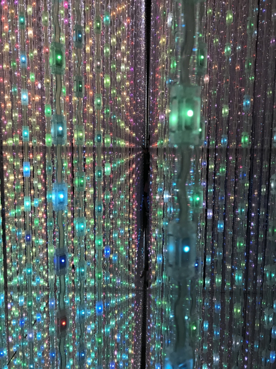 中に入ると、通路は真っ暗で、各部屋の光の作品が際立つ作りになっていました。2フロアあり、下のフロアから上のフロアを巡って出口という流れがスムーズです。出口前で下のフロアに戻ることができますが、下のフロアから出口に行くことができなくて、散々歩き回りました。彷徨うというのがテーマなので、図らずも正しい楽しみ方?ができましたが。