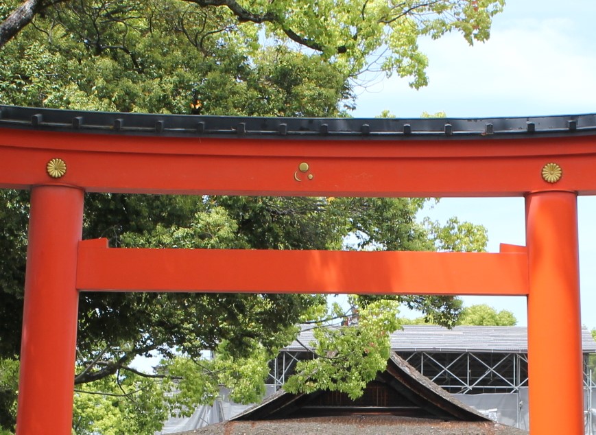 この神社は梅や椿で有名ですが、城南鳥居の上部にある、太陽と月と星を組み合わせた「三光の御神紋」は必見です。この神紋は三光(さんこう)と呼ばれていて、神功皇后が新羅遠征の際に軍船に立てた旗にこの紋章があり、その旗をこの神社に納めたのが由来と言われています。