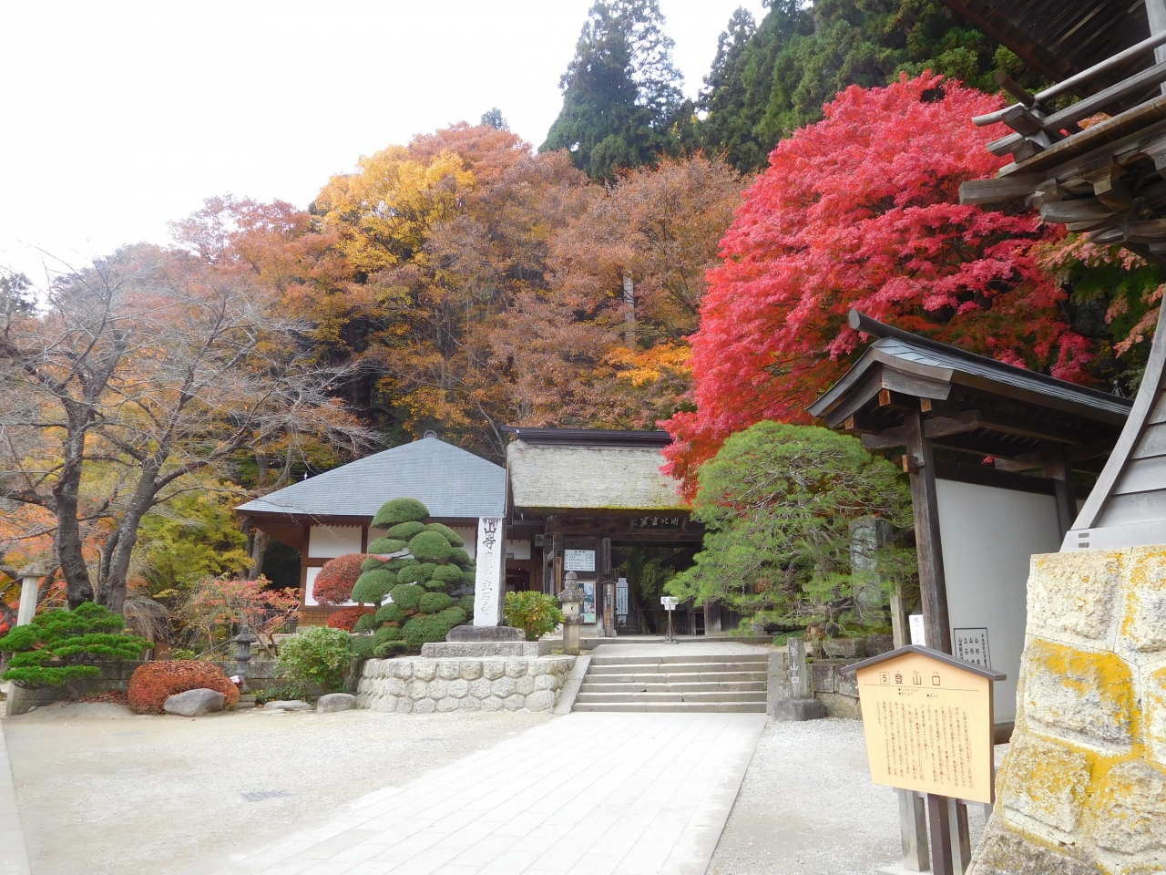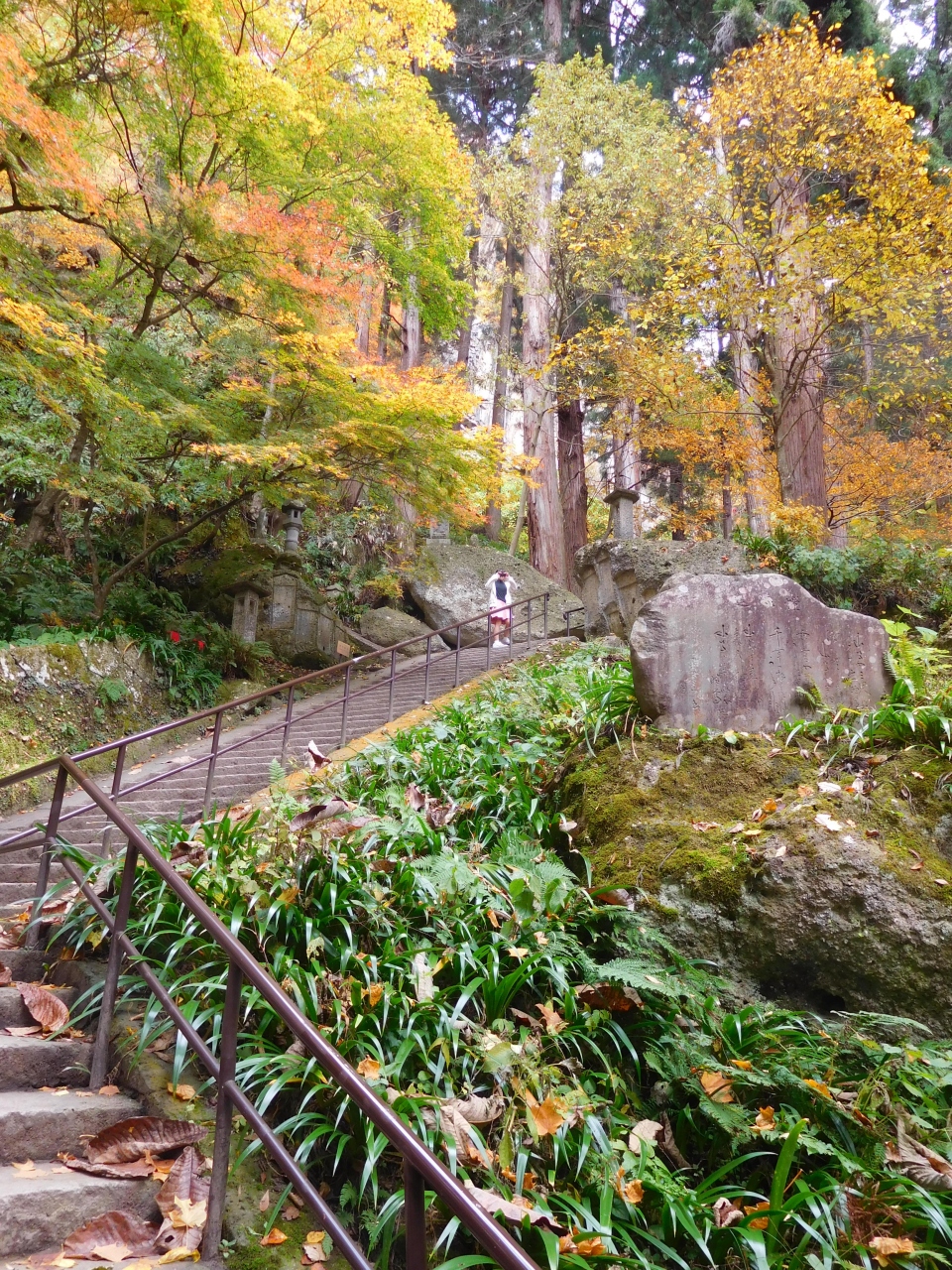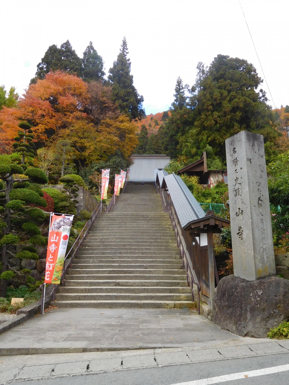 山寺では、登山口近くに駐車。快晴でしたが、少し冷やりとする天気。でも、1000段ほどの階段を登るので、厚着をしないで出発。小学生の孫娘はぴょんぴょんと苦もなく登って行きますが、あとの3人は休み休みです。五大堂まで登れば、すばらしい見晴らしです。そして、蔵王は山の上はもう紅葉は終わり近かったのですが、山寺では紅葉も十分楽しめました。