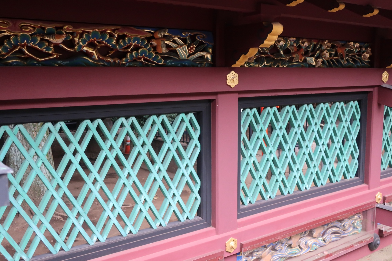 上野東照宮の社殿の四方を囲んでいる塀が透塀です。緑の塗られた菱型に組まれた格子が透けて見えるので透塀と言う様です。社殿と同じく重要文化財に指定されており、格子の上下には色彩艶やかな鹿、鼠、猿、雀、牡丹等の動植物、魚の彫刻がとても見事です。