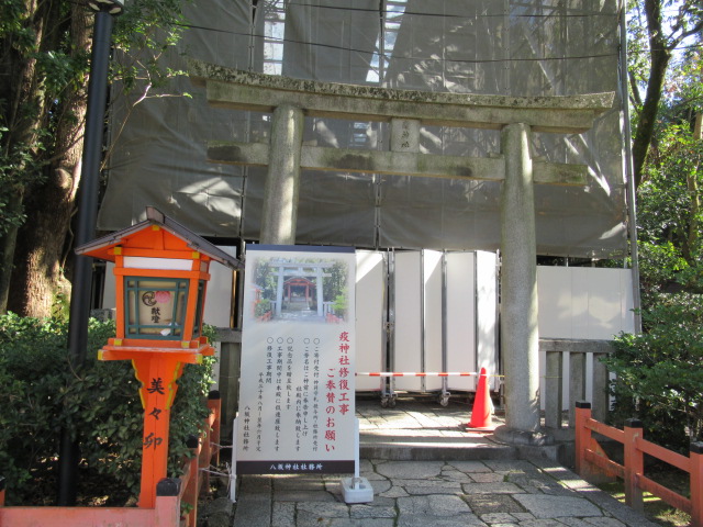 京都観光で欠かせない八坂神社を散策してきました多くの観光客の入口となっている西楼門から入りましたそして真正面に見えるのがこの「疫神社」です。疫神社は蘇民将来を祀っていて厄除けのご利益で有名です。ちなみに祇園祭の時に山鉾町で売られている「ちまき」はその起源で玄関に吊るして一年間のお祀りしますね。石鳥居の奥は現在修復工事中だったので内部を見ることはできませんでしたが一礼しました。
