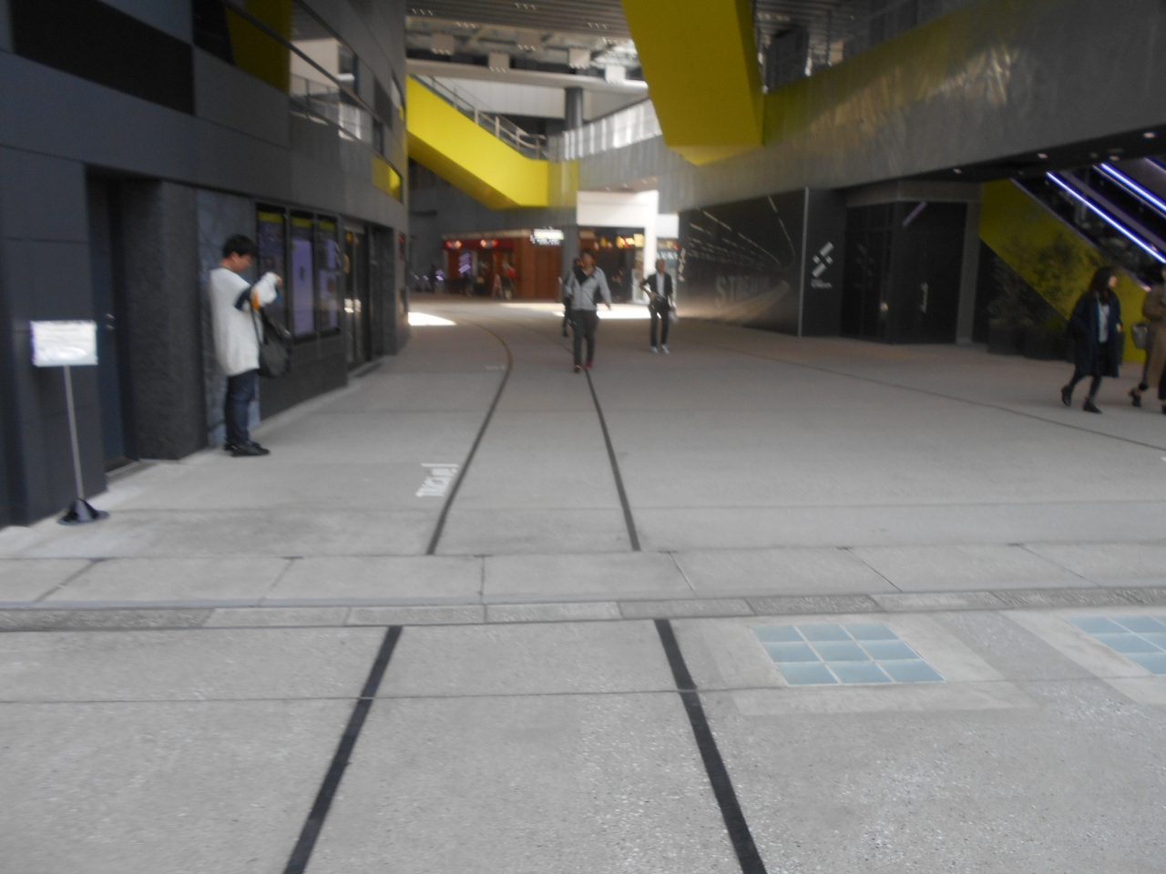 2階のメインモールには、広い通路に昔のレールのようなタイルの列が二本埋め込まれ、東横線を彷彿とさせる光景に感激した。