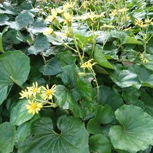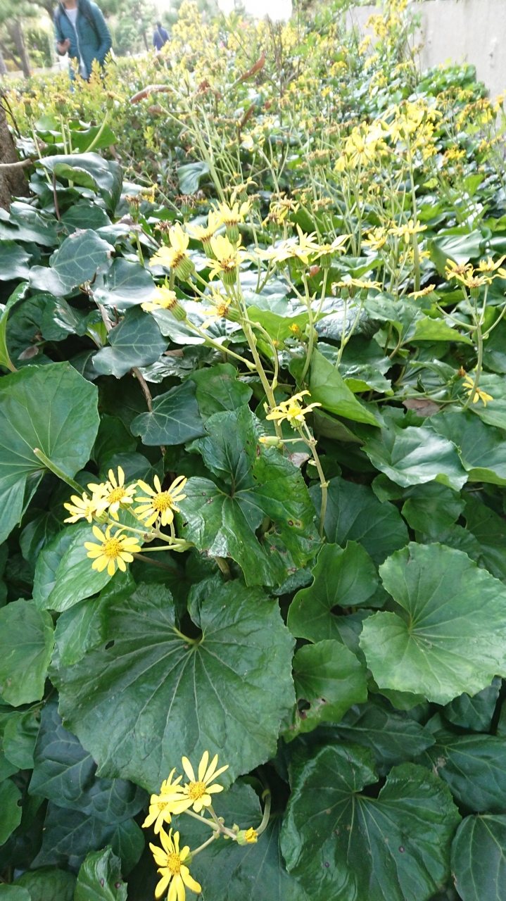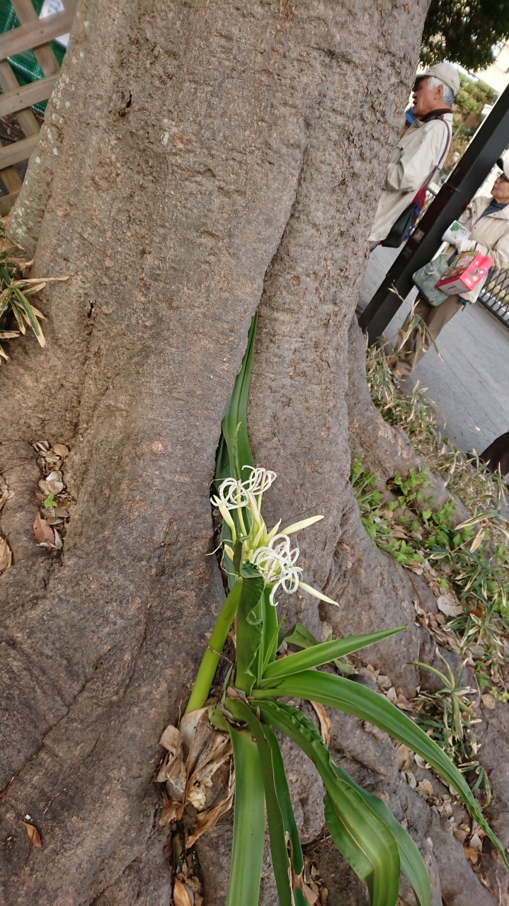 歩道も平らでなく、一段高くなっている。近くにはツワブキが沢山綺麗でおまけに季節外れの浜木綿が木の根の間に咲いていた