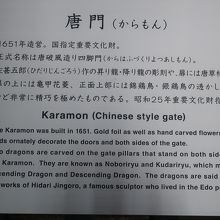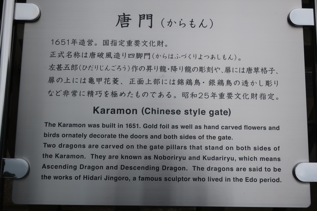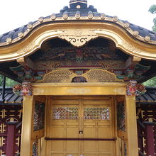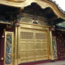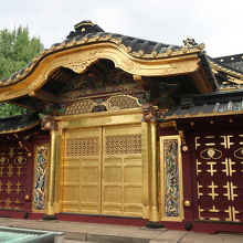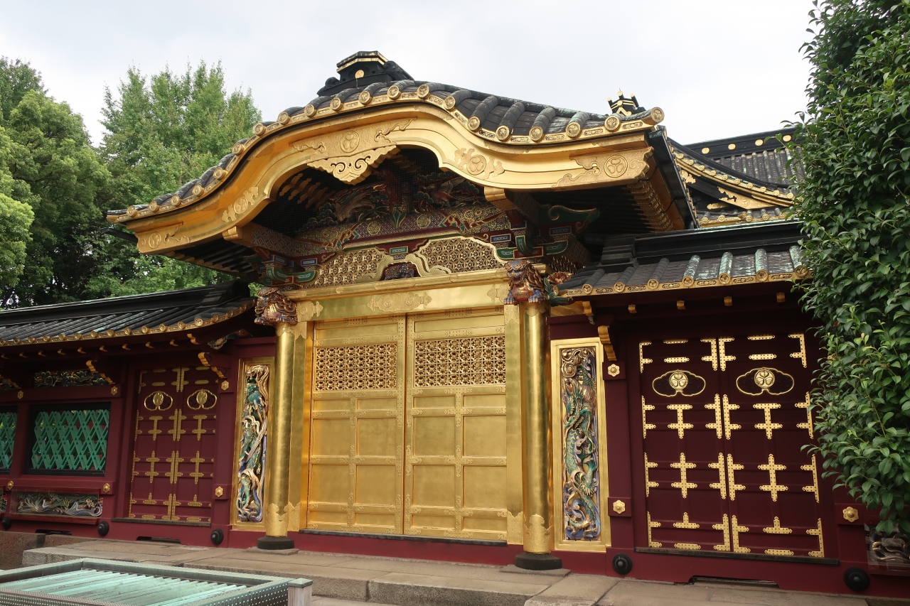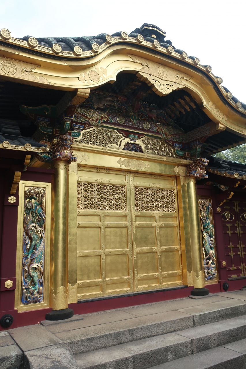 上野東照宮の参道を歩いて行くと突き当りにある金色の扉を持つ朱塗りの門が唐門です。日光東照宮の唐門とはスケールが違いますが、細かな透かし彫り、龍、獅子、鳥の彫刻がとても見で、更に煌びやかな門です。無料で見られるのは表側だけで、裏側を見るためには拝観料を払って社殿側に回る必要があります。裏側の彫刻も松、竹、梅が彫られ一見の価値ありです。