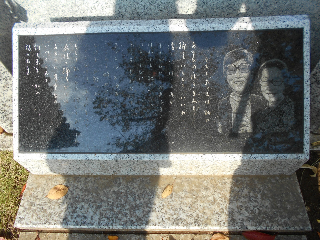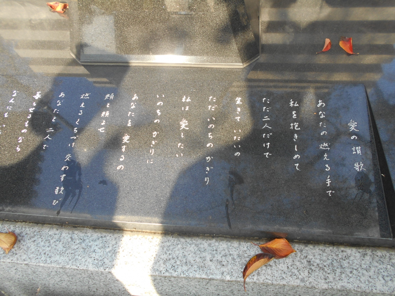 墓地の入口近くにあり、すぐ見つかる独特のデザインの石碑です。シュモクザメの頭を立てたような黒御影の石碑で、手前に、代表作「愛の讃歌」の歌詞が記載された石碑や、顔写真と「ラストダンスは私に」の歌詞が記載された石碑もありました。