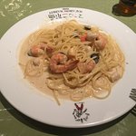 前菜、(その前に別料金でクラムチャウダーを注文。美味しかったー)、パスタまたはピザ(私はエビとホタテのクリームパスタ、嫁はピザのマルガリータ、息子はミートソースパスタを注文)こちらもなかなかおいしかった。