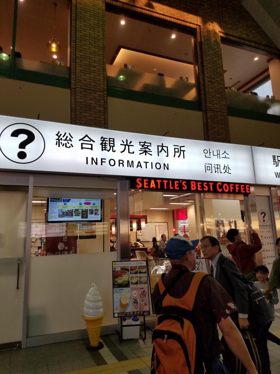 長崎駅の改札口前、コーヒーショップの並びにに長崎市観光案内所があります。周辺はみどりの窓口やお土産店フロアがあり、休日の夕方でたくさんの人がいました。パンフレット充実、スタッフも常駐しており、観光都市長崎の玄関口で頼りになる施設です。