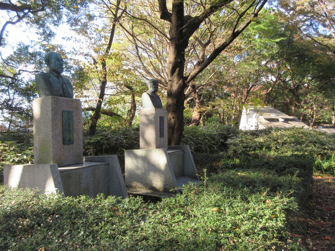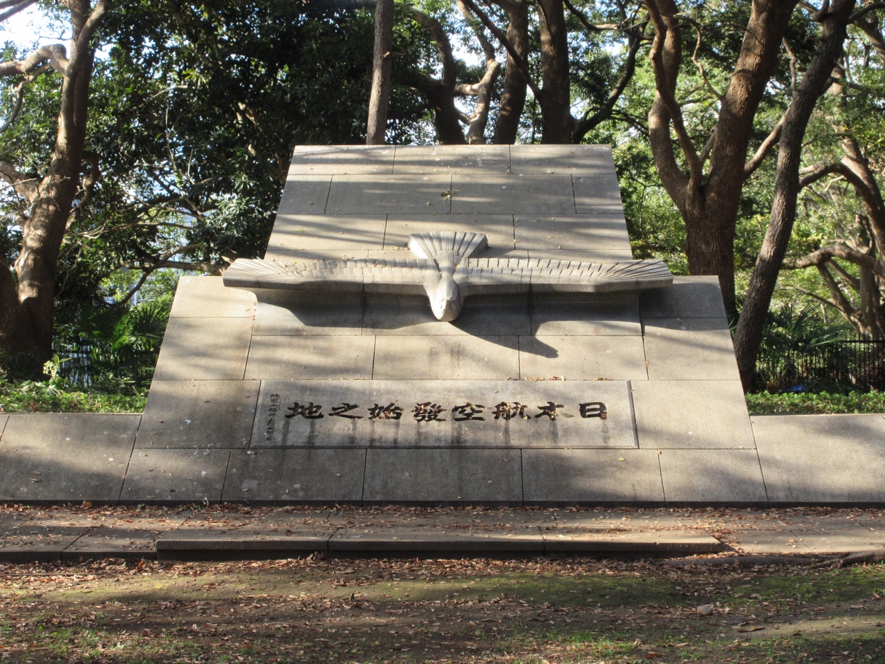 代々木公園南口から西門に向かって歩くこと1分ほどのところに造られた大きな碑で、鳥が翼を広げ飛び立とうとする姿が描かれています。100年以上前に復葉機と単葉機を操縦し、日本航空史上初めて飛行したことを記念して建てられました。碑の隣には機を操縦した2人の胸像も建っています。高度70m、3000mの距離を4分で飛行したそうです。今でこそ、世界各国に容易に行けるようになりましたが、その原点になった出来事だと思います。わずか100年の間に驚異的に発展した航空の世界です。その進歩に2人の操縦士はびっくりしているのではないかと思います。