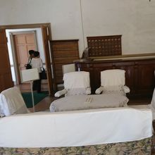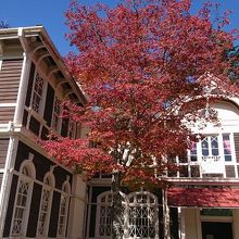 木造2階建ての西洋式ホテルで白の窓枠がおしゃれです。建物内に入るとかなり古さを感じますが、当時のホテルの豪華さは感じ取れました。玄関前のもみじが綺麗に色付いていました。