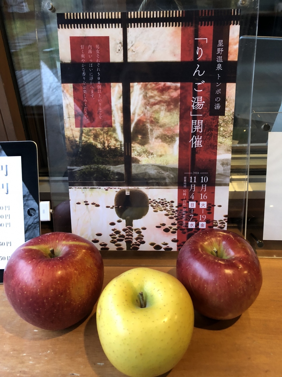 秋のトンボの湯。今回はりんごの湯❗️浴槽に浮いたたくさんのりんごが良い香りでした。