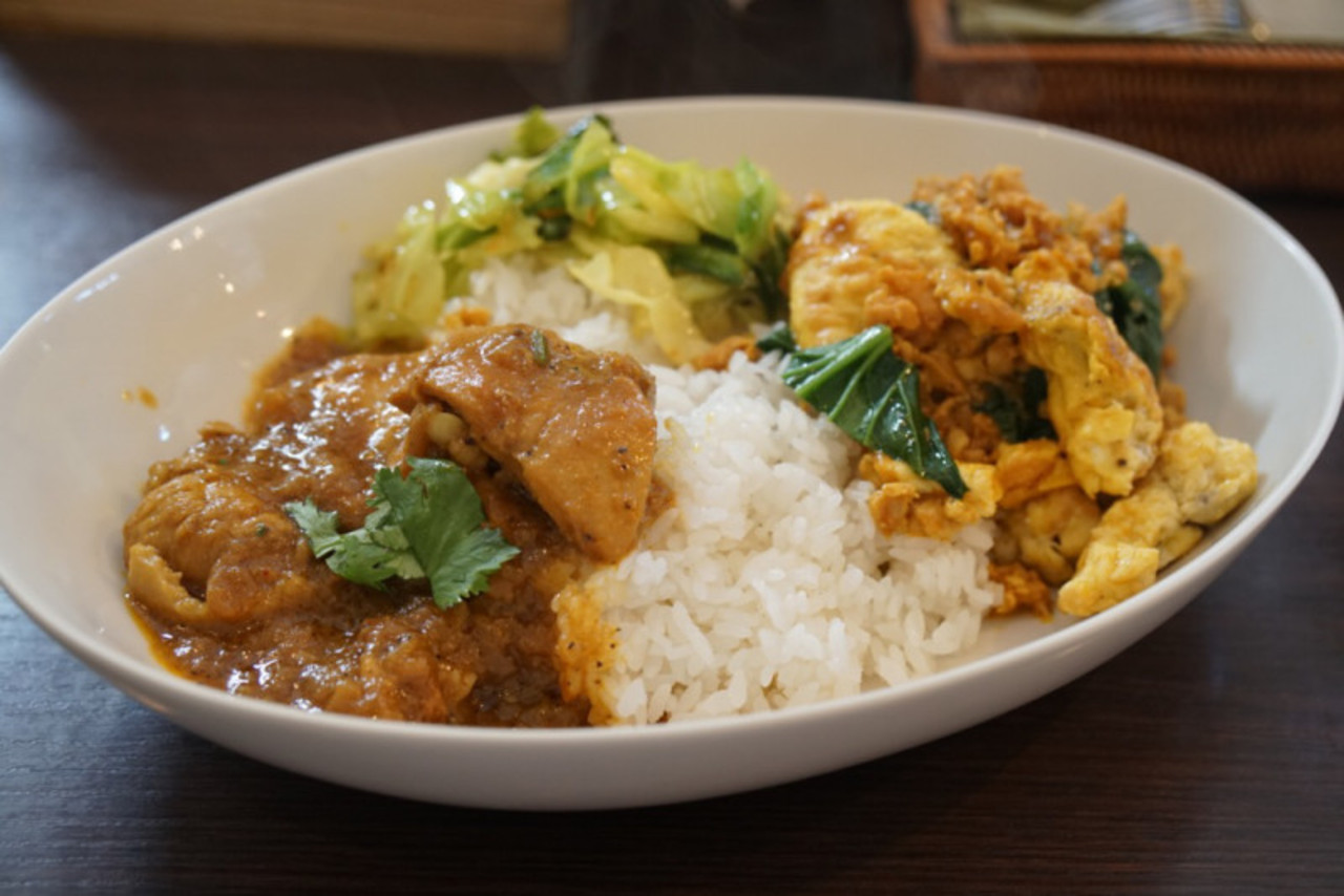 いわゆるインドカレーのようなアウトプットではなく実に日本的なシルエット。そういえば、看板にカレーライスと書いてあったのが印象的でしたが、確かにこの言葉が似合います。キーマもカレーというより炒め物といったほうがイメージが近い。炒り卵に大きめなひき肉で構成されております。辛さはほとんど感じないですが、卵や挽肉がスパイスの香りをほんのりとまとっております。