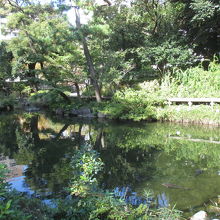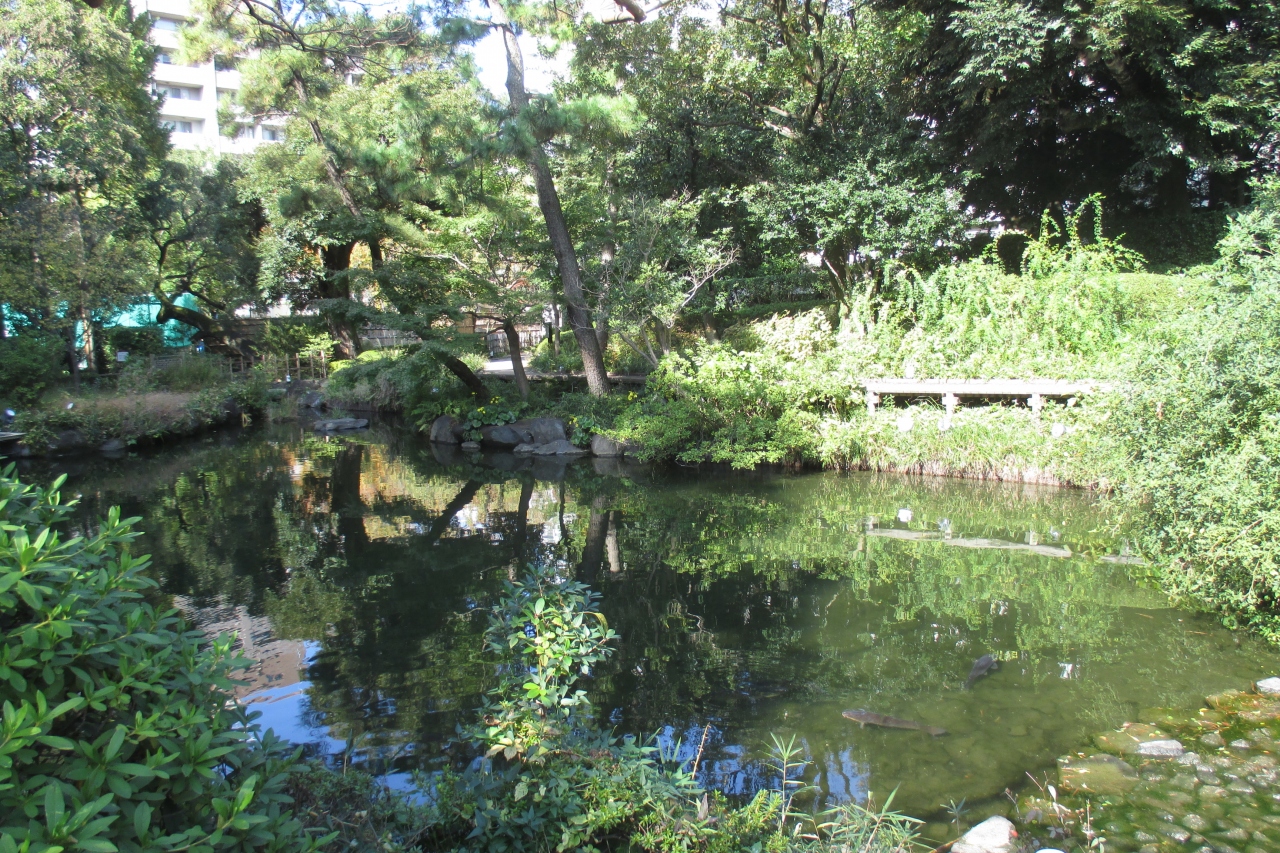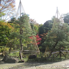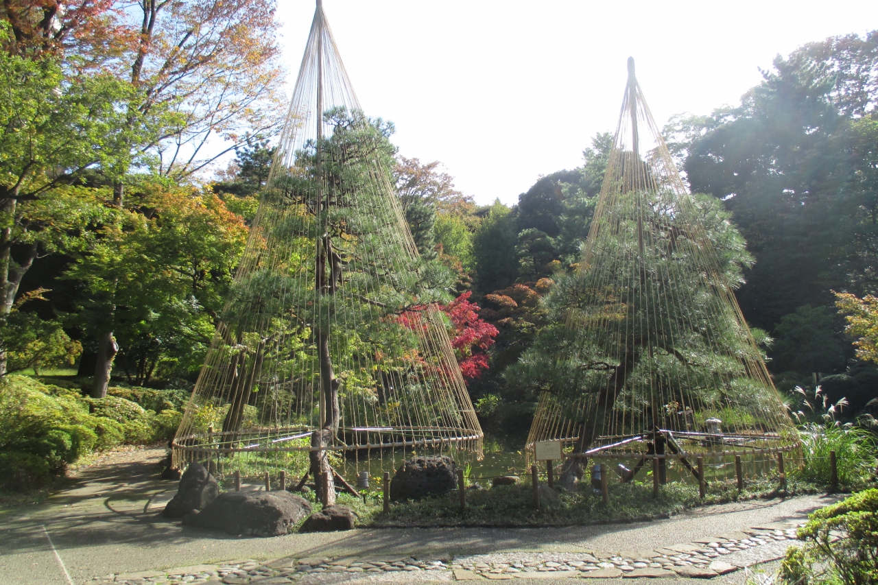 11月の半ばの訪問でしたが、すでに綺麗に雪吊りが出来ていました。これでいつ雪が降っても大丈夫と、冬の準備万端といったところです。公園そのものはそれほど大きくはありません。もちろん、個人のお庭だったら大きいですがね。(明治時代に、子爵相馬邸の庭園として整備されたものだそうです)池を谷底とした谷間の庭園のせいか、お仲間とお散歩に来たと思われるお年寄りの大きめの話し声が園内全般に響いていました。