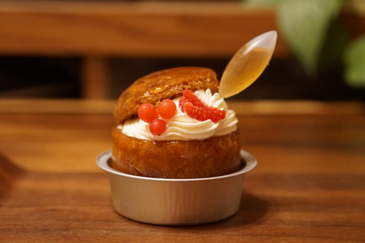 スポイトが突き刺さっておりますがこれはラム酒。ブリオッシュの生地の中に馴染むラム酒は強烈で間違いなく酔いを誘発させます。車で訪問した人は間違いなく食べてはいけないやつです。マスカルポーネの生クリームは上品な甘みとの相性も抜群です