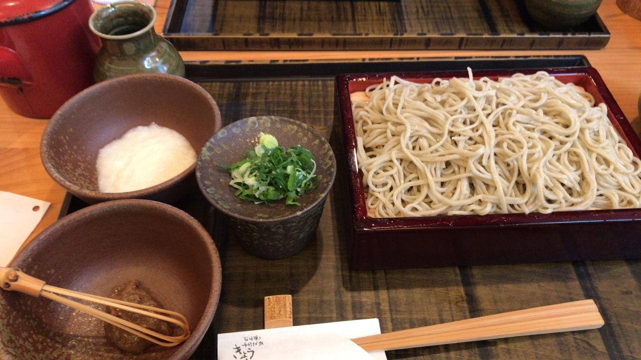 とろろのざるそばを注文しました。うろ覚えですが、クルミの味噌だれもついていて美味しかったです。福井県のお蕎麦は麺が太いという話を聞いたことがありますが、こちらのお蕎麦は細くて白い。つるっと食べてしまいました。メニューは1000円強のものが多買ったです。