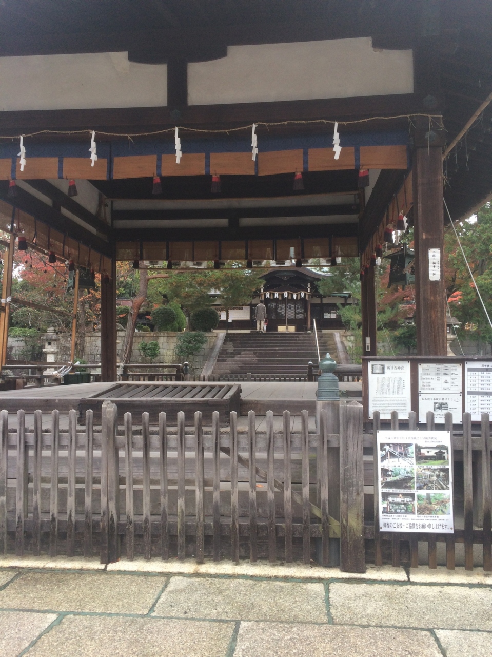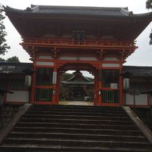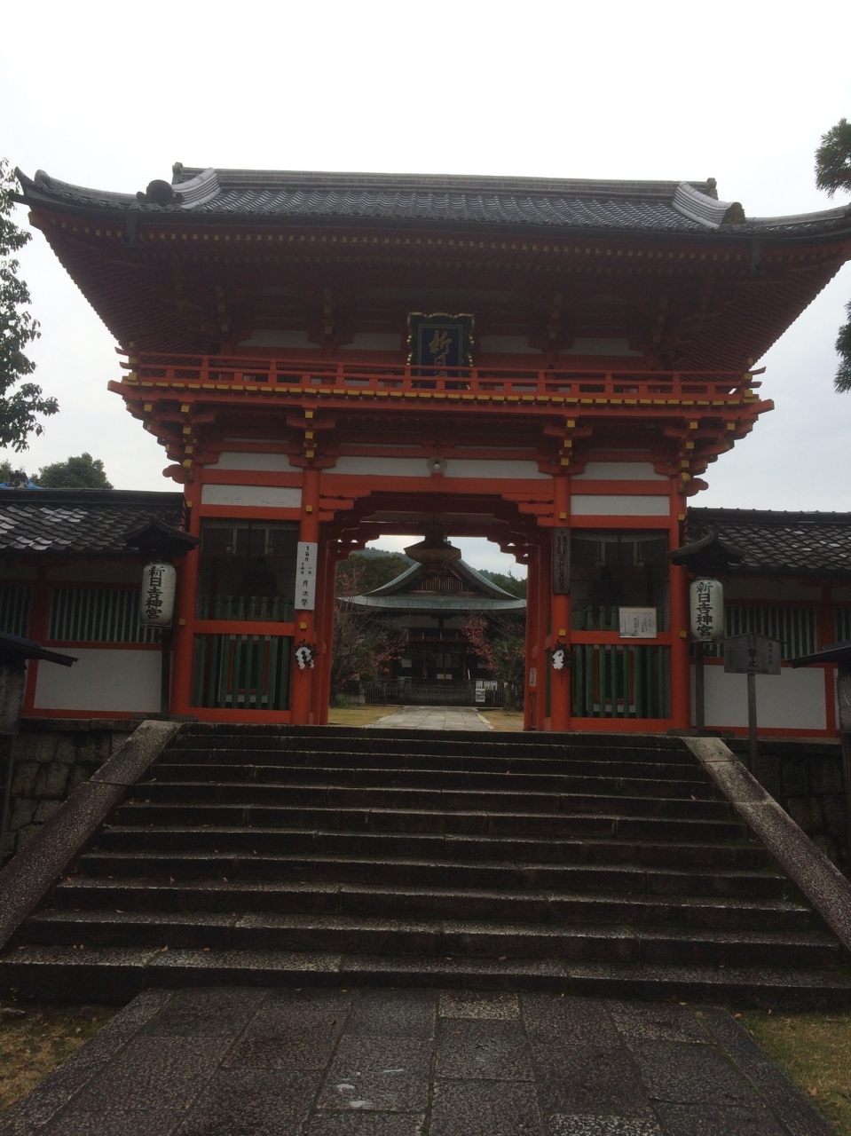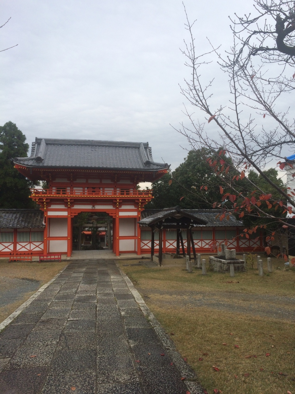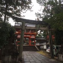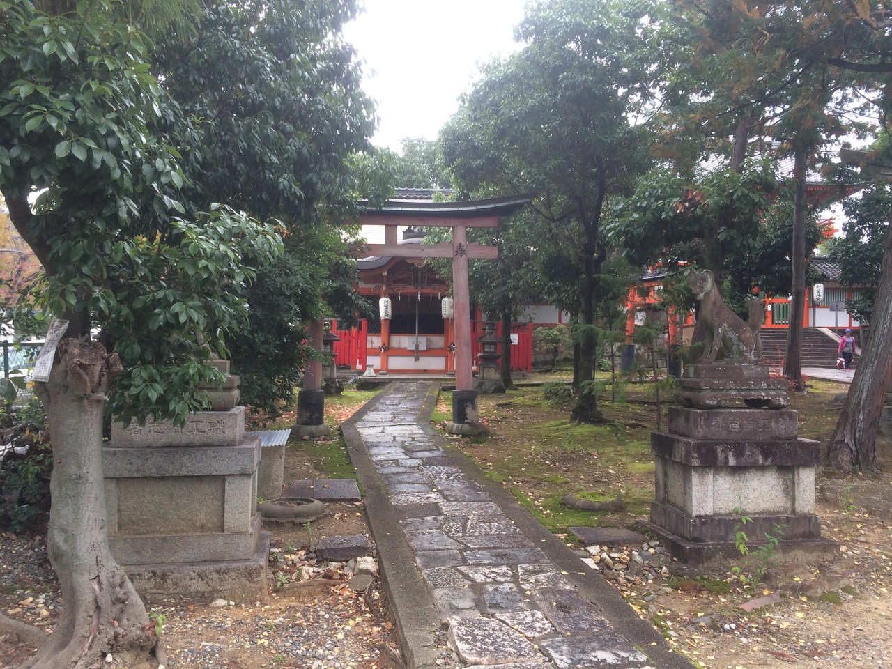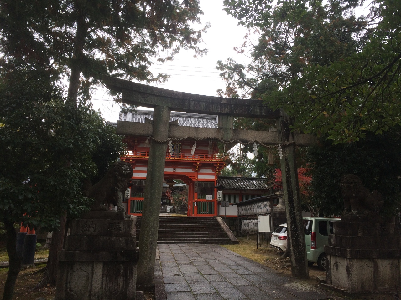 智積院付近からなだらかな坂を上がったところにあり大きな鳥居を上がって潜ると境内で、門が朱色でひときわ目立ちました。人が少ない穴場の神社でした。社殿の裏には大きな木があり、神官のような格好をした猿の像が印象的でした。