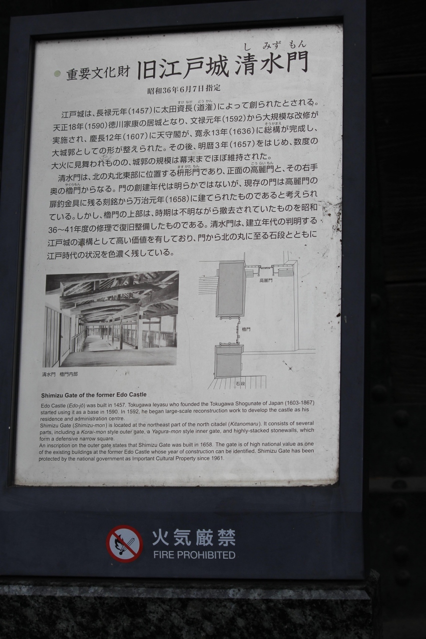 11月の休日、地下鉄の九段下駅を降りて北の丸公園の中を散策しました。田安門から北の丸公園に入りました。北の丸公園では散策ツアーがありその人たちのあとをついて各種のスポットを歩いて回りました。清水門を案内する看板があり清水門を目指して歩きました。落差の大きい階段があり下るとありました。江戸時代に清水寺があったことから名付けられたそうです。