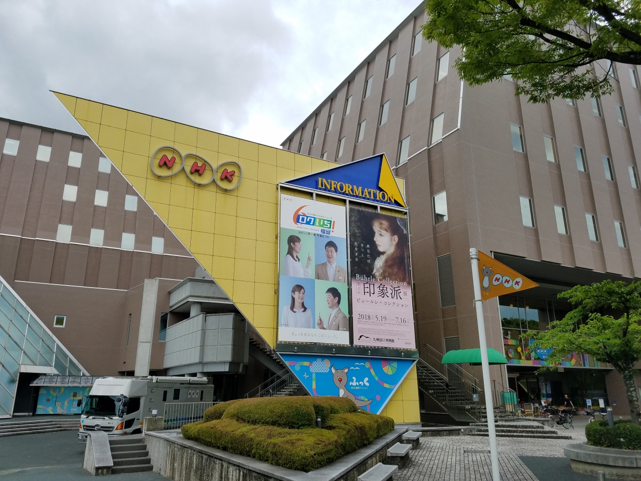 NHKギャラリーは、大濠公園南側の大通り沿い、護国神社の並びのNHK福岡放送局の1階にある無料公開スポットです。施設は局内の各ホールを結ぶ通路エリアにあり、絵画をはじめ各種の企画展示、お馴染みキャラクターもあり、気軽にアートに触れることができます。