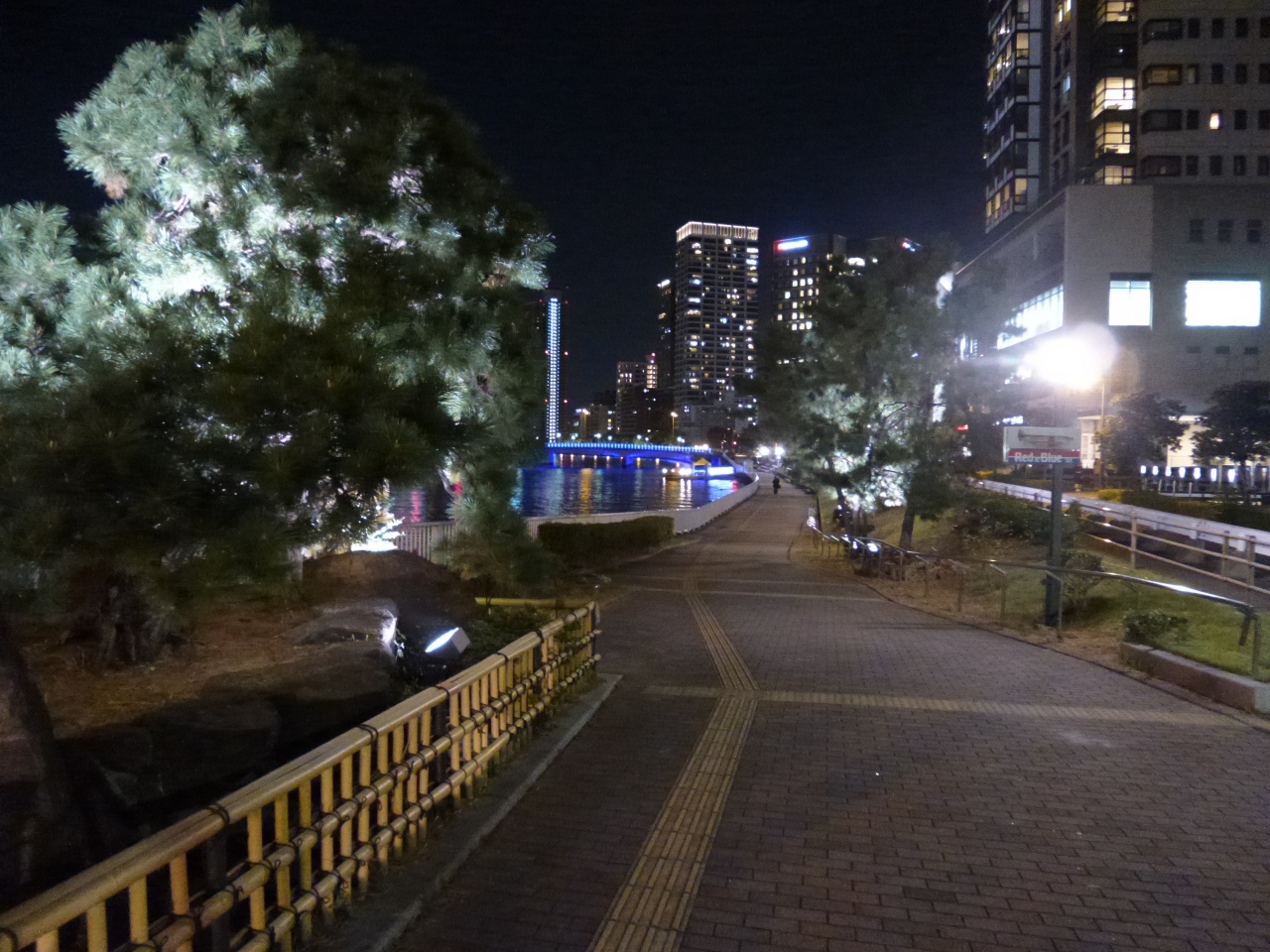 いわゆる「福島浜緑道」です。この遊歩道から見る中之島の夜景や堂島川の流れはなかなかのものです。夜は人通りも少なく都会の喧騒とは無縁の世界です。遮るものが少ないので眺めは良いですが、その分、風も強いので防寒対策をお奨めします。