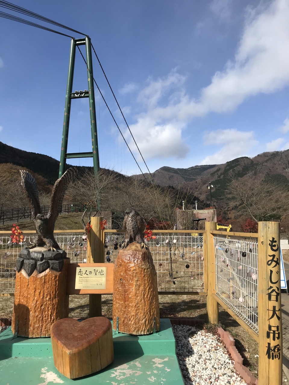 勤労感謝の日行ってきました。紅葉も終わりでしたが、天気は快晴でも、風が強く、防寒対策要でした。吊り橋は有料で@300yen でした。吹きっさらしなので風が強い時は要注意です。