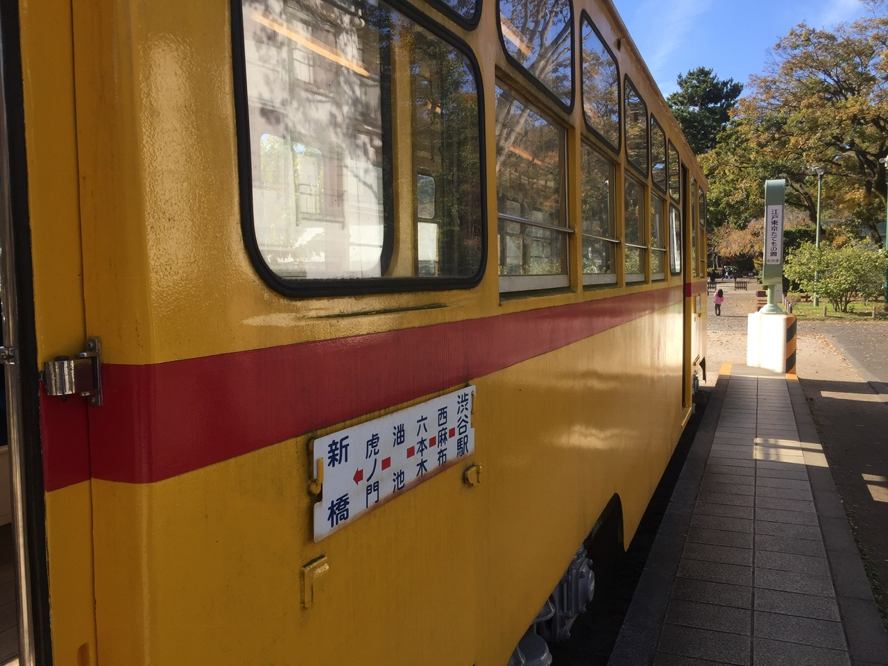 江戸東京たてもの園のシンボル的な存在。今にも走り出しそうな路面電車が存在感を放っています。真っ黄色のボディが秋空に映えて綺麗でした。乗り降りマナーの標語などが再現されていると萌えますね笑 路線版も残されていて鉄道ファンとしてもそそられます。