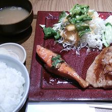 ご飯・味噌汁の他、全部で11種類ある料理の中から2種類選べるそうで、その中から今回は「いわて純情豚の蜂蜜ロースト」と「三陸サーモンの粒マスタード焼き」を頂きました。