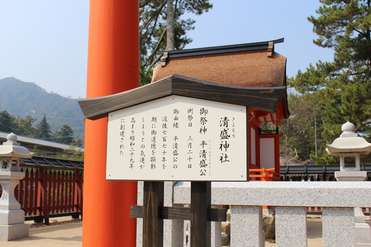 広島県の人気観光スポット、宮島にある神社です。厳島神社を抜けて、西松原の松林のなかにひっそりとあるこじんまりしていました。平清盛の没後770年を記念して建てられたそうです。厳島神社と同じ朱色の鳥居と社殿がきれいでした。