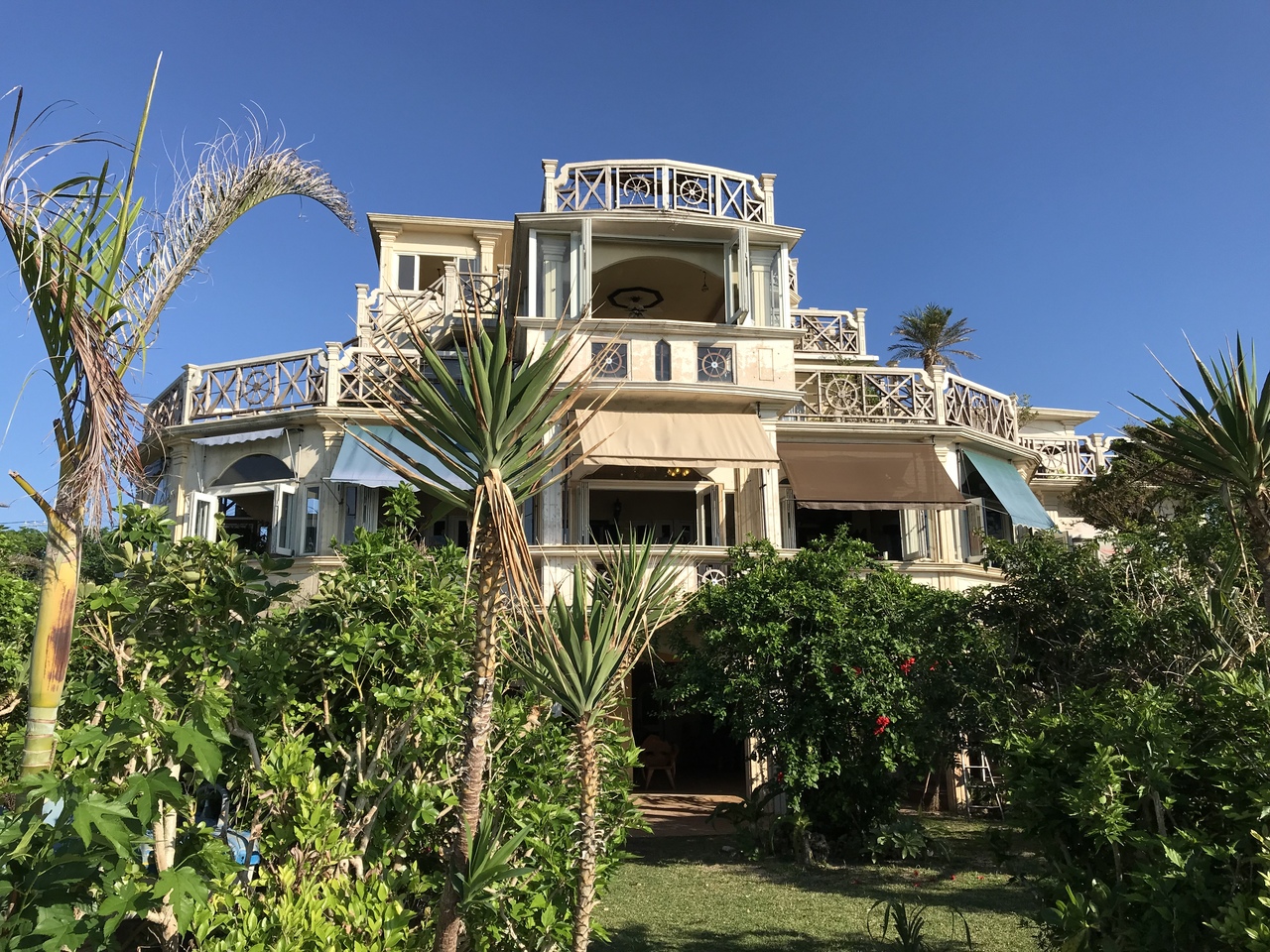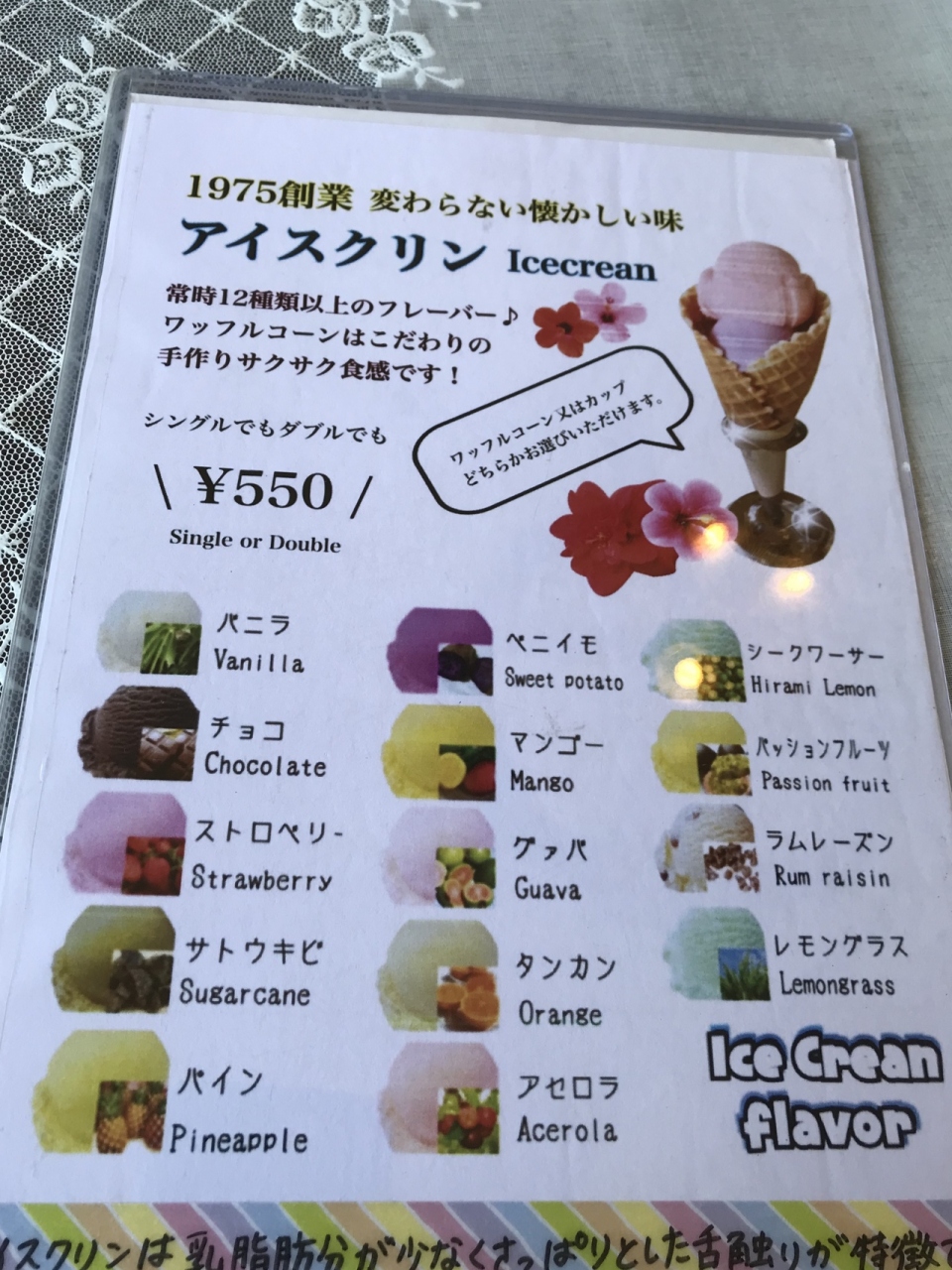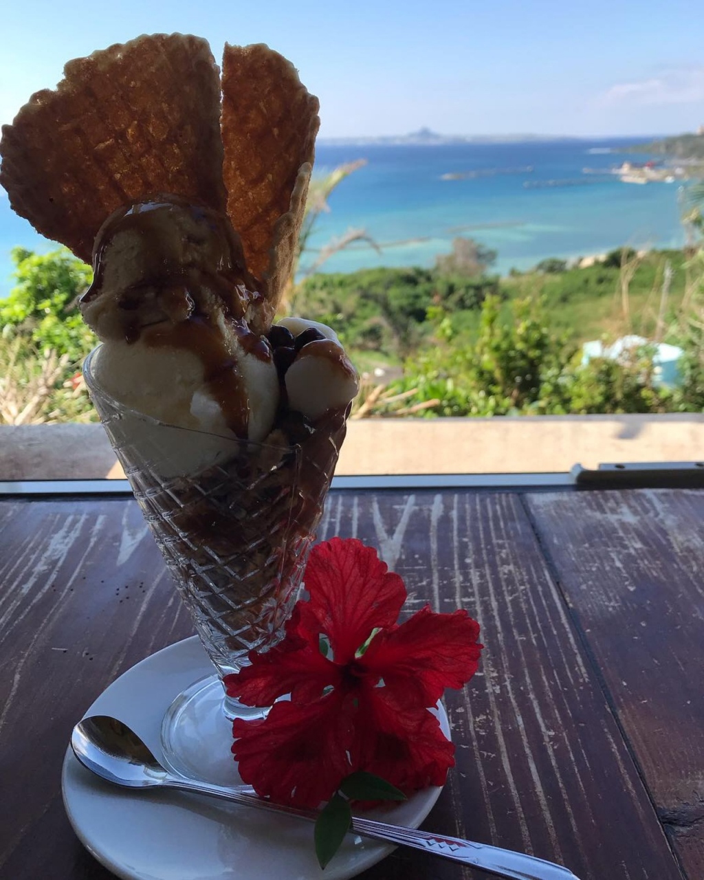 沖縄の路上でよく見かけるアイスクリンの直営カフェです。入り口から植物やシーグラス、貝殻アートがいっぱいでテンションが上がります。階段を上がって二階がカフェになっており、大きな窓から海を見下ろすことができます。メニューは14種類のアイスクリンをメインに、ぜんざいやきな粉がのった和風パフェなども。
