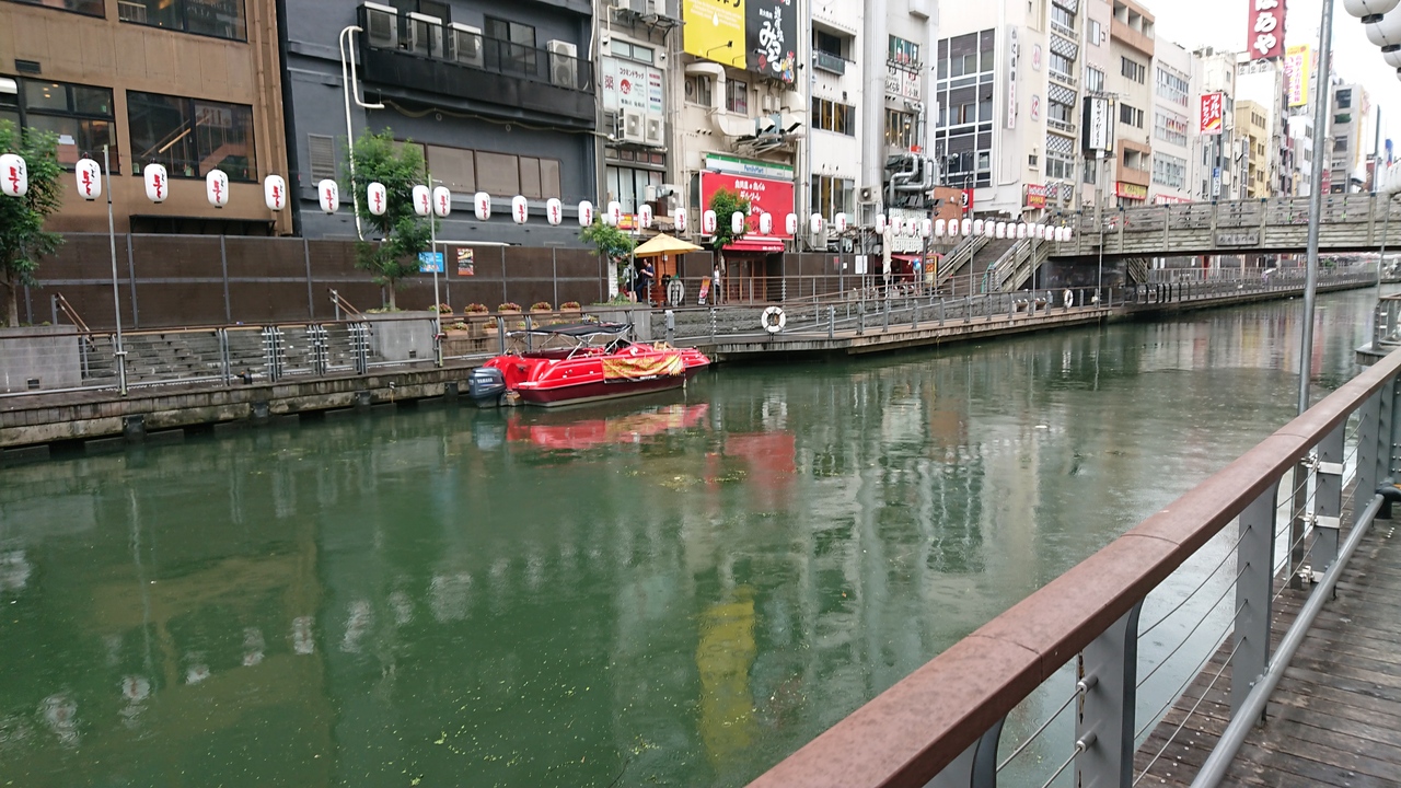 阪神が優勝するとファンが飛び込む道頓堀です。堀の脇は参道になっていて、通行量の多い橋と比べて人通りも少ないのでまったり散歩ができます。乗りはしませんでしたが屋形船みたいのもありました。有名なグリコの看板も道頓堀沿いにあります。